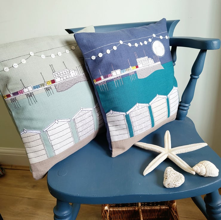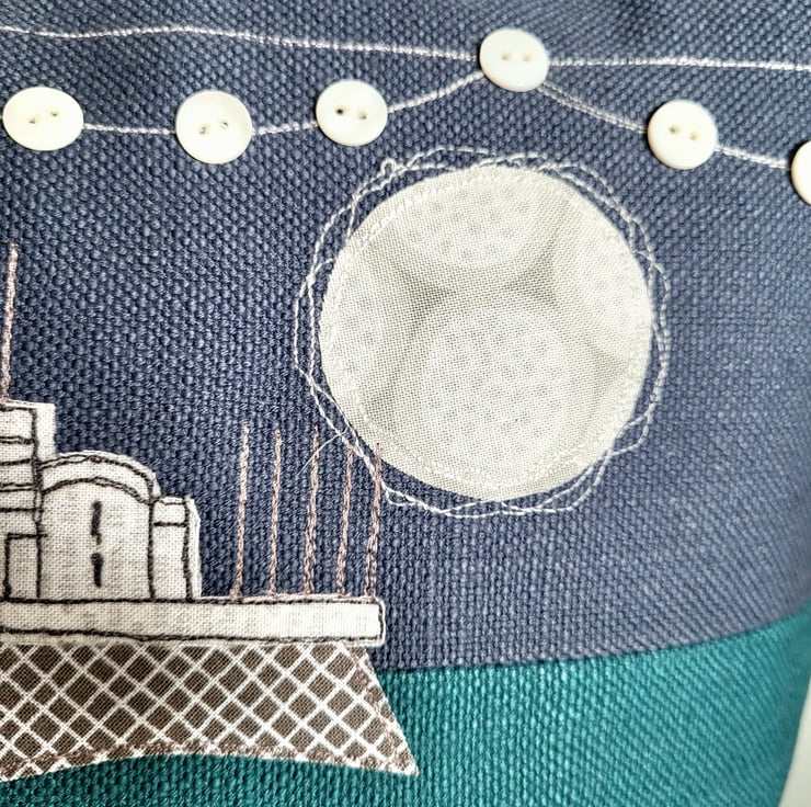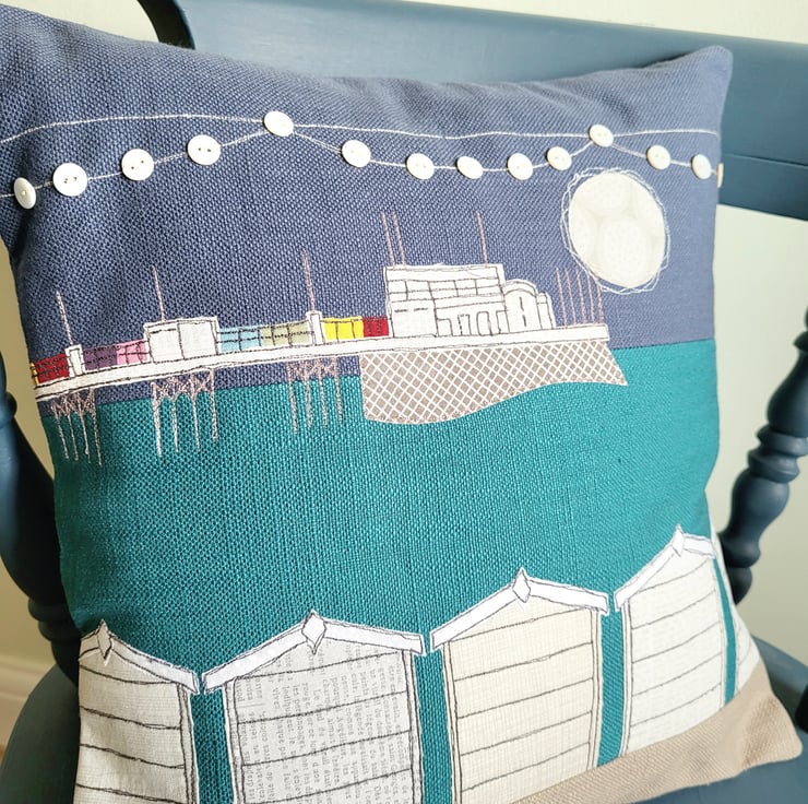 This handmade Moonlight Pier Cushion has been carefully sewn using freemotion machine embroidery & applique fabrics. Finished with string of buttons for the promanade lights. Inspired by the living near Worthing Pier with it's stained glass windows.