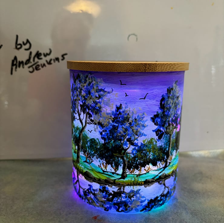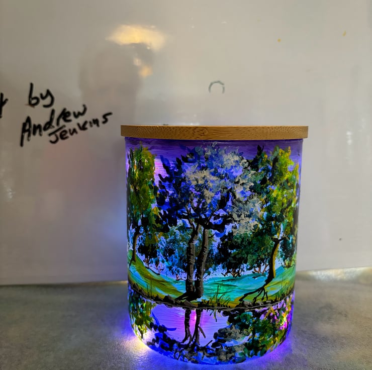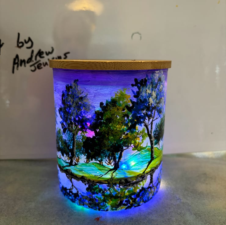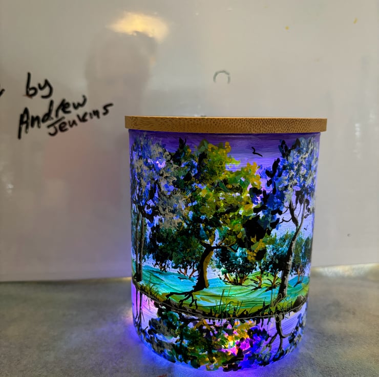 A hand painted and fired glass vase with wooden lid by Andrew Jenkins