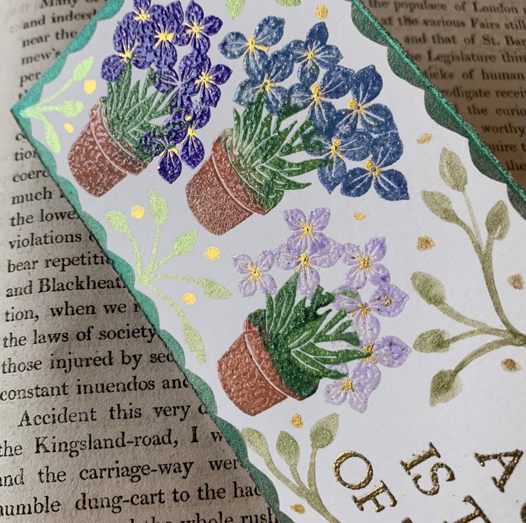 The design is very pretty, using a combination of embossed and hand painted elements. The metallic watercolour adds a beautiful shimmer to each bookmark, especially to the scalloped border