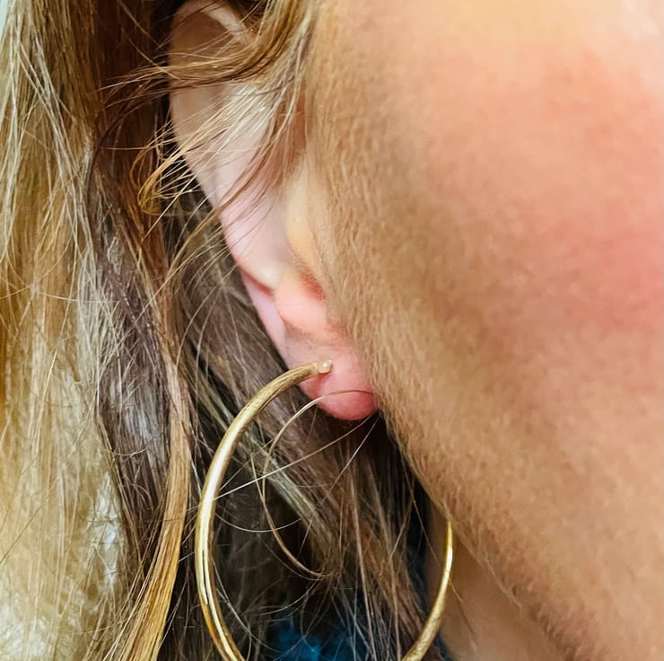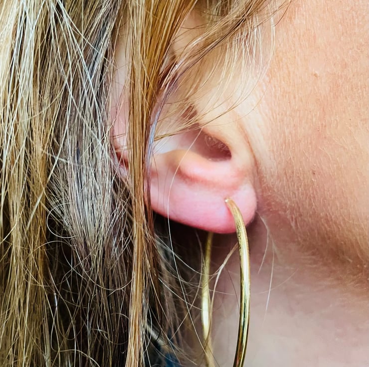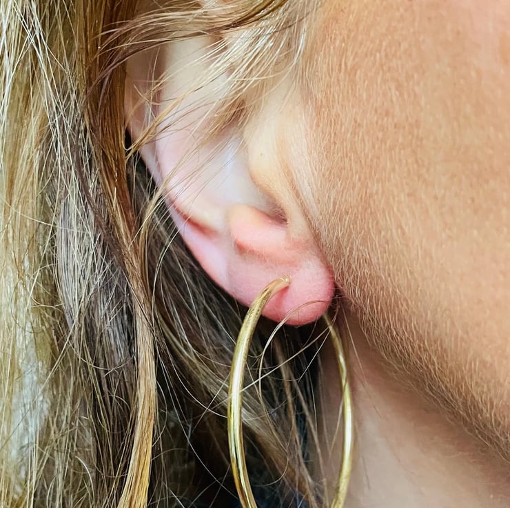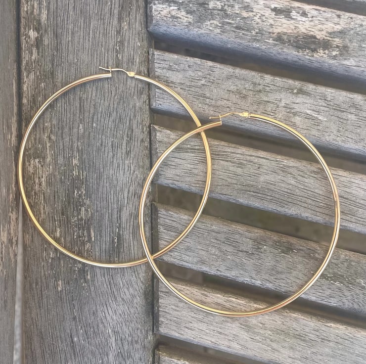 9ct gold 45mm earrings with a hinged fastening. They are light in weight approx 2.5g so are comfortable to wear as for such large hoop earrings it is not advisable to have heavy earrings as they will permanently stretch the earlobe. They are also a 2mm thickness. I also make this design in 65mm and 74mm. Hallmarked, one of our best selling designs.