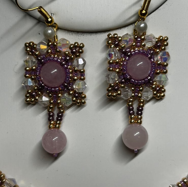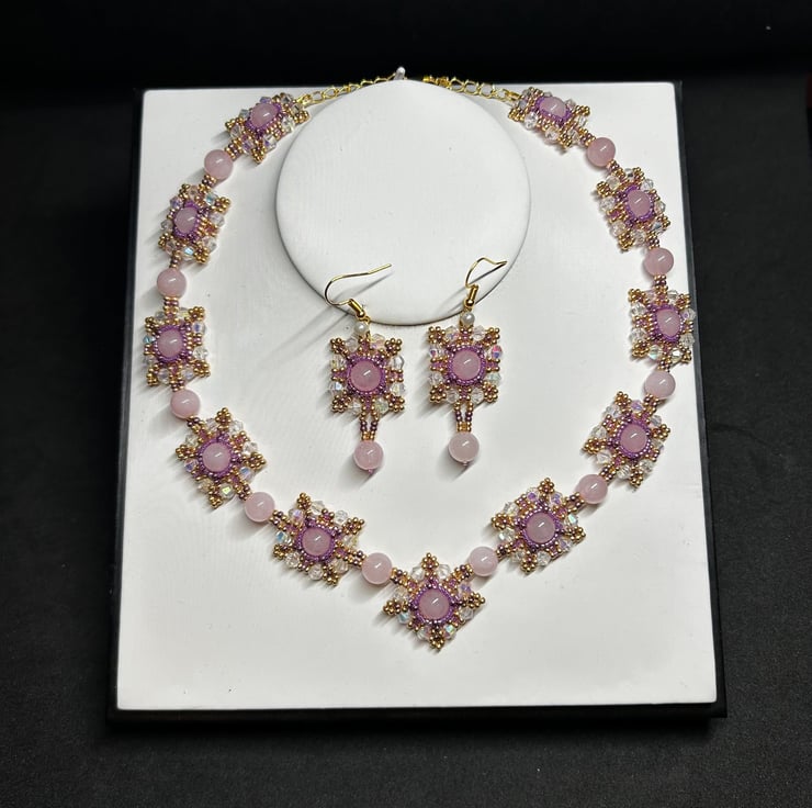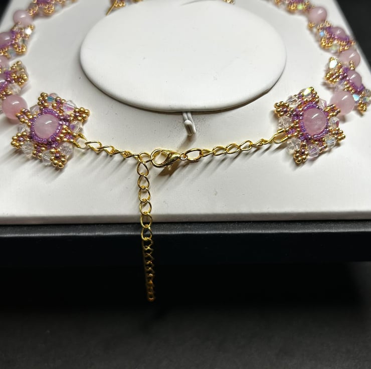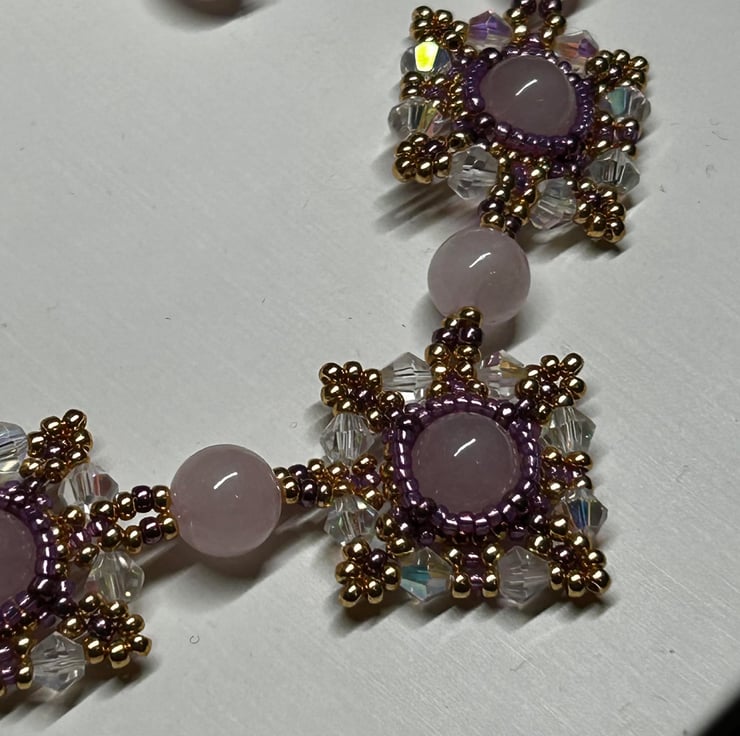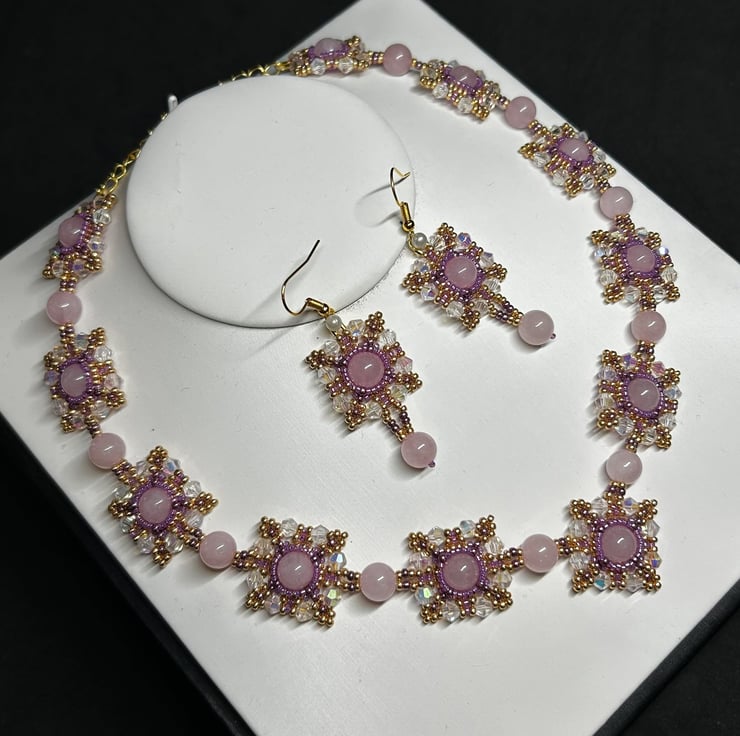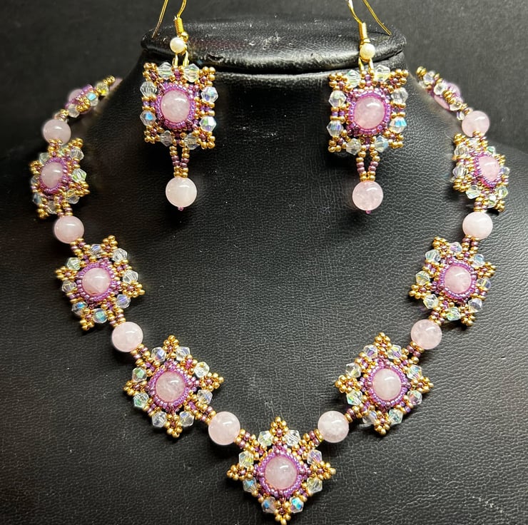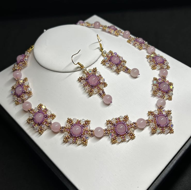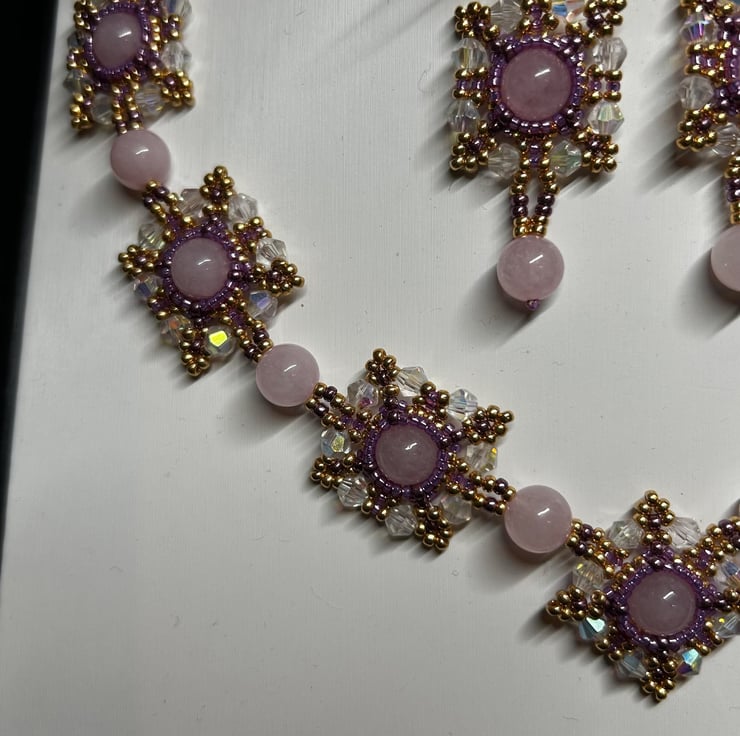 There is a lot of Rose Quartz here. IU used some to form complex seed beaded components using Miyuki glass seed beads and Aurora Crystals, and then I used the plain gemstone to form links between each segment. The result is a stunning set with a fabulous sparkle combined with the calming quality of genuine Rose Qiartz.