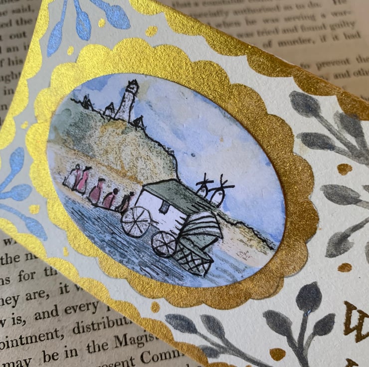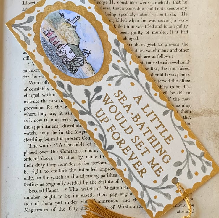 Mrs Bennet's famous quote from Pride and Prejudice by Jane Austen appears on this pretty bookmark. I'd love a seaside holiday as a cure to make a return, although being dipped in the sea from a ' machine" as shown here does not appeal.