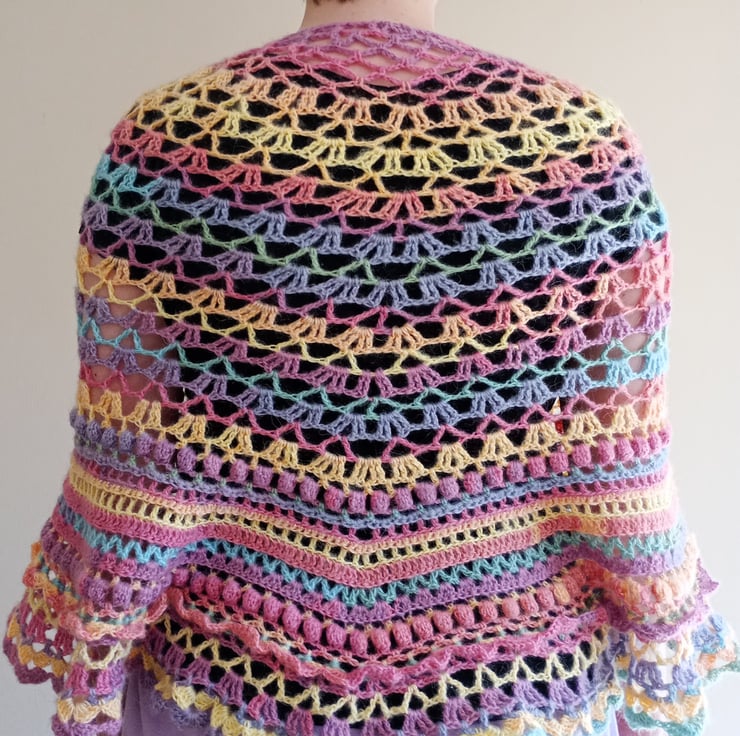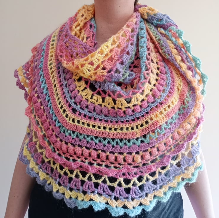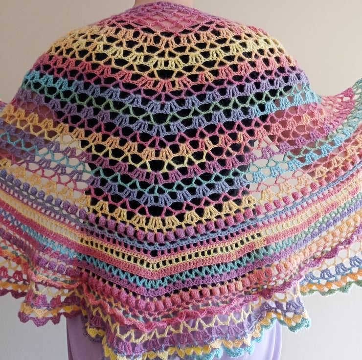 A beautiful, semicircular crocheted shawl with lovely drape, ideal for use as an additional layer on cool days.