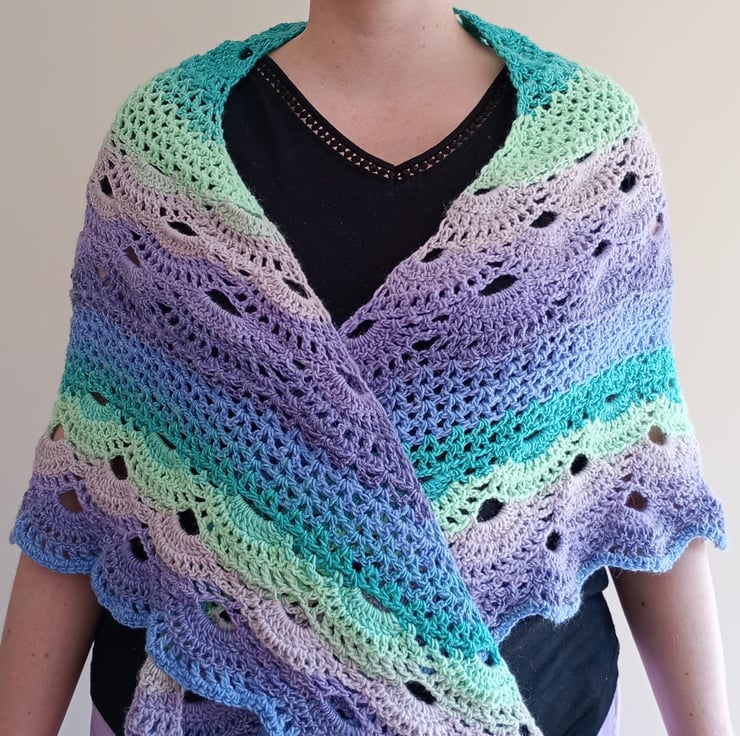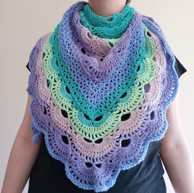 A pretty, triangular crocheted shawl in shades of green, blue, and purple, ideal as a layering piece or for cool evenings.