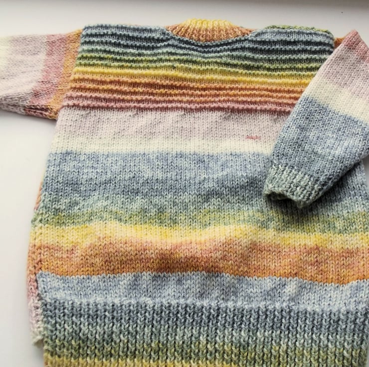 Hand knitted by me. Shades of Autumn Toddlers Jumper Sweater. Round neck with garter stitch pattern and shirttail back. Knitted in medium weight acrylic and wool blend yarn. hm155