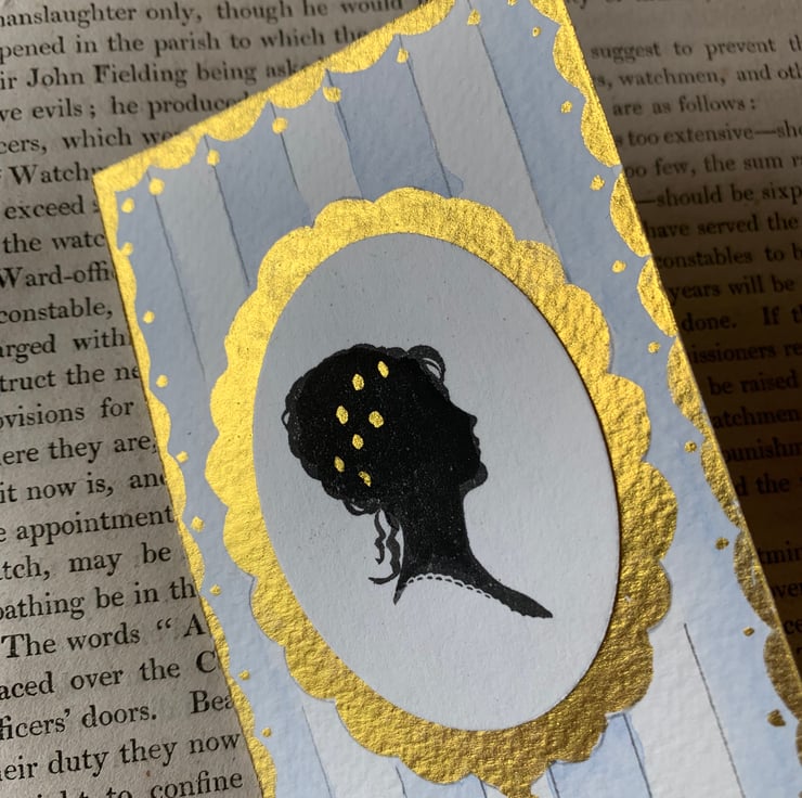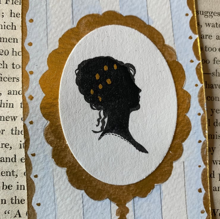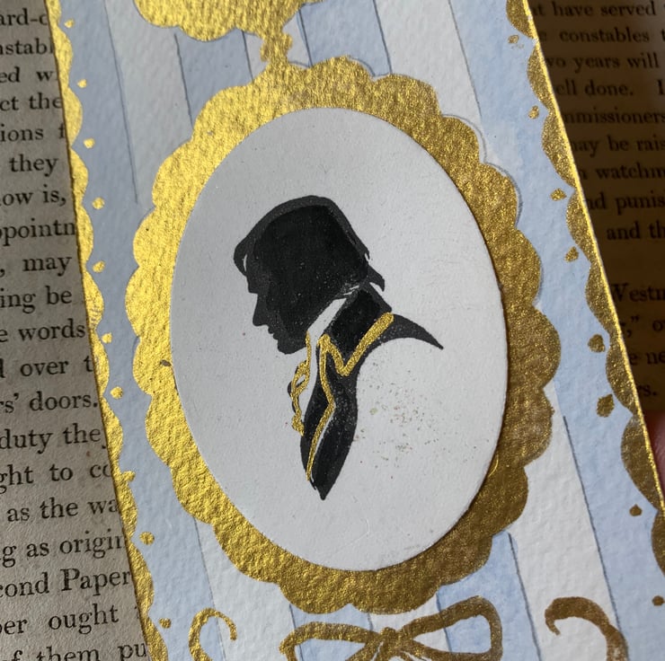 Silhouettes of Elizabeth Bennet and Mr Dacry from Pride and Prejudice adorn this special bookmark. Hand painted and decorated with gold highlights, they are attached to the bookmark. The bookmark doubles as a greetings card and is much more useful! The reverse is left plain for your own message.The metallic watercolour adds a beautiful shimmer to each bookmark, especially to the scalloped border