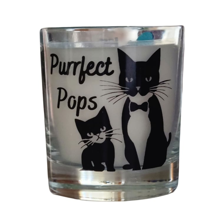 A scented candle with a black vinyl cat and kitten design and caption Purrfect Pops. Lovely gift for father's day or for a Dad's birthday. Handmade using high quality rapeseed and mineral wax blend, the finest range of premium fragrances, poured into quality glass containers and supplied in a kraft box. The design on the scented candle is made from permanent waterproof printed vinyl which can be cleaned (hand wash only) allowing the glass to be re-purposed as part of your home decor after the candle has burned.
