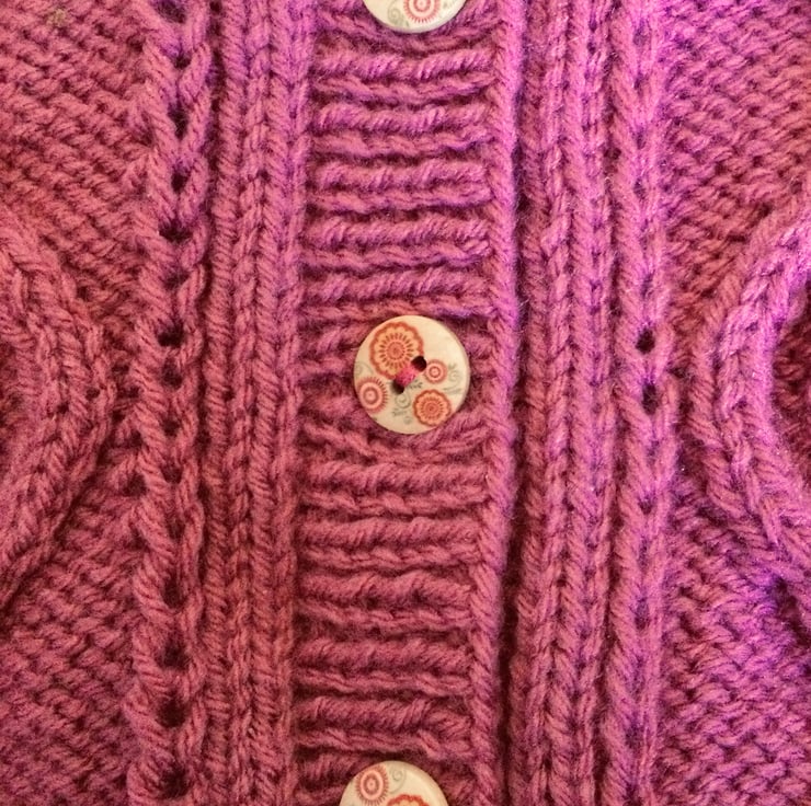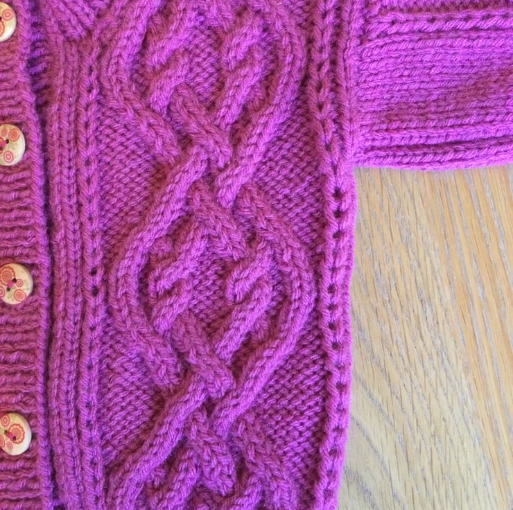 Cabled toddler’s cardigan hand knitted during my retirement spare time. I have used a good quality 100% acrylic yarn in a pretty clover shade and have followed a pattern from my huge stock. The cardigan fastens with five wooden buttons with flower design.