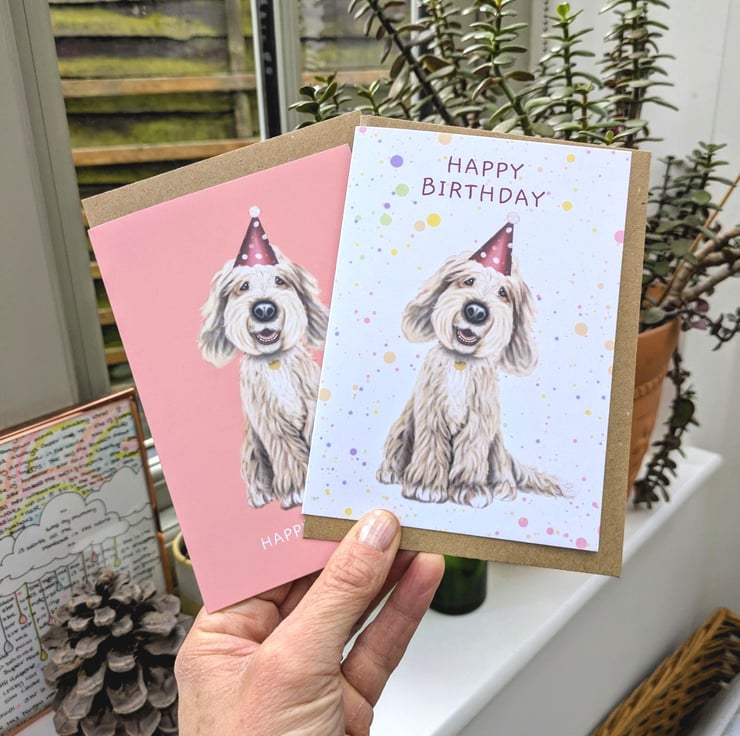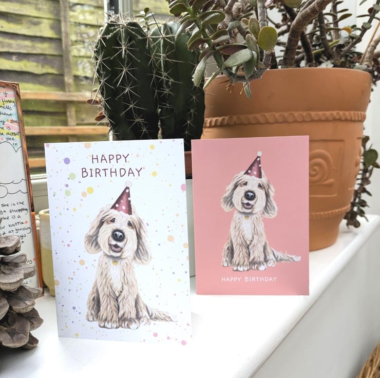 'Happy Birthday' cream Labradoodle on pastel spotty background - Eco Friendly Card.