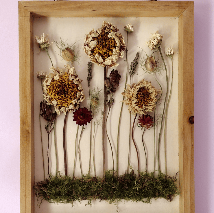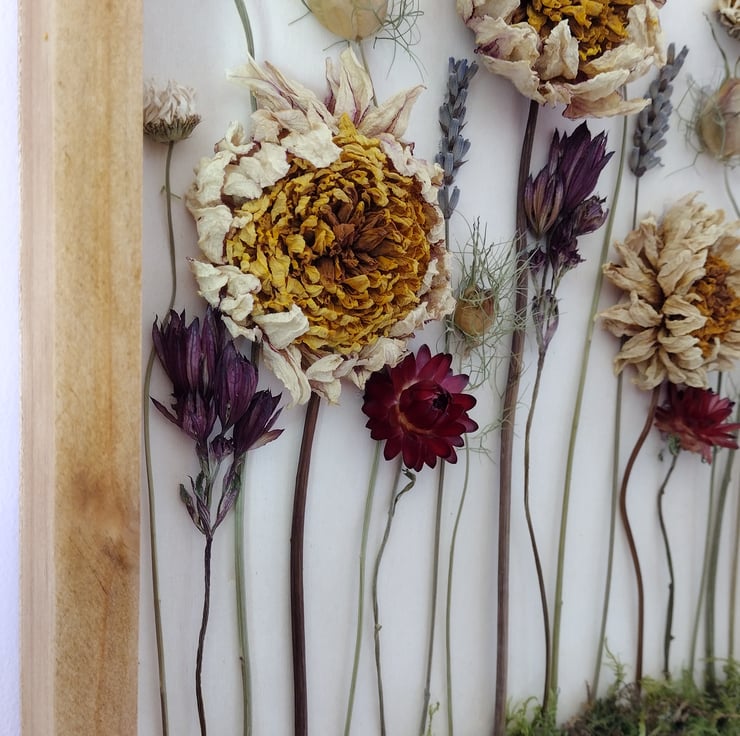 The flowers were organically grown in peat free compost, picked and dried right here in the Fens from our wildlife friendly, half acre garden. The moss is also from our garden. Perfect for the eco conscious among you.