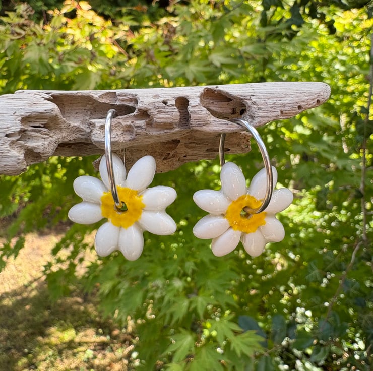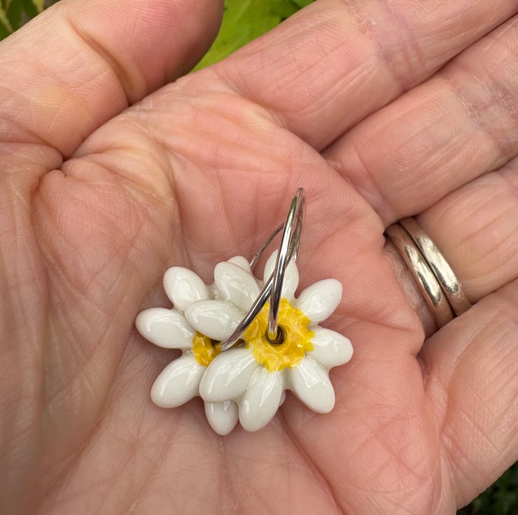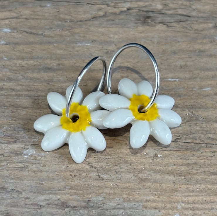 Brighten up your jewellery collection with these stunning sterling silver endless hoops adorned with handmade glazed porcelain daisies!
