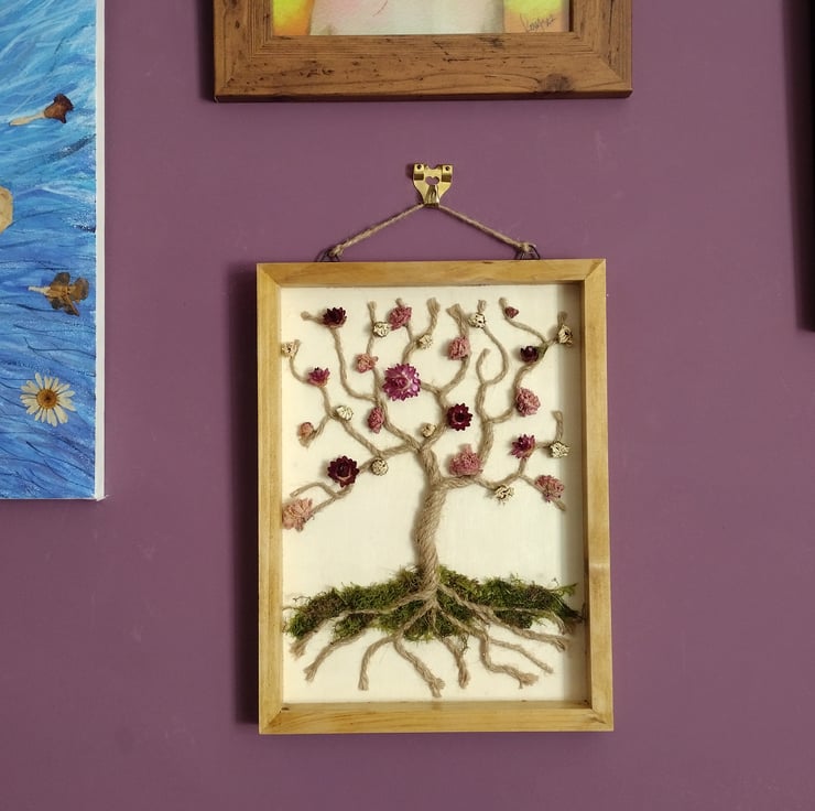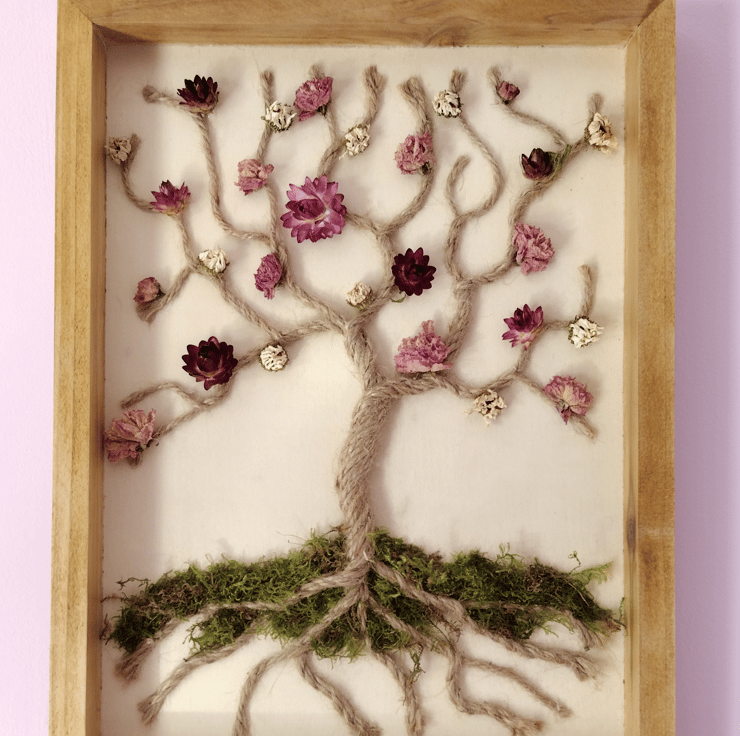 This piece shows a tree created from jute twine, in bloom with a selection of beautiful dried flowers, carefully arranged onto a natural wooden background, all nestled on a fluffy bed of moss.