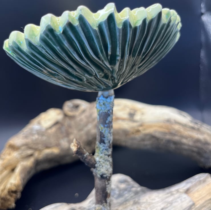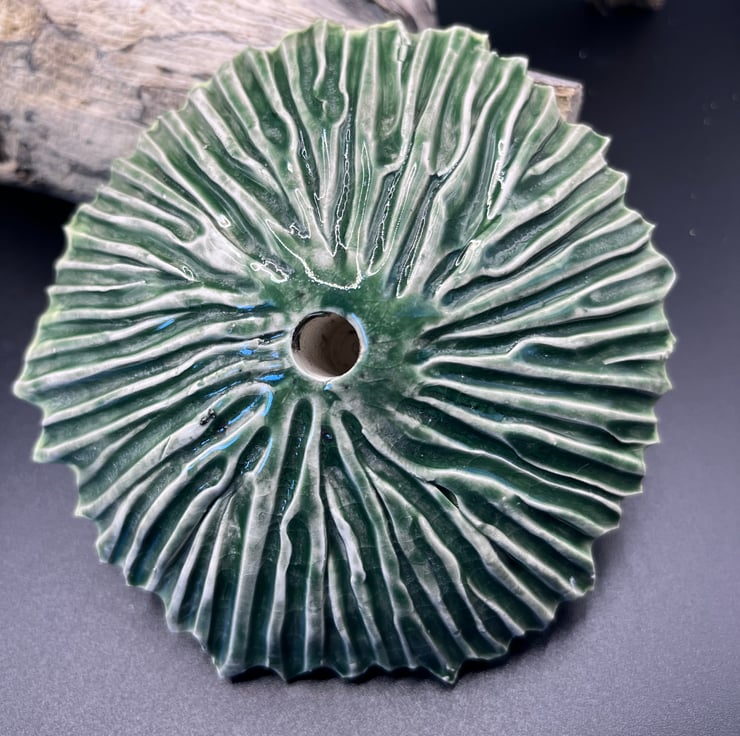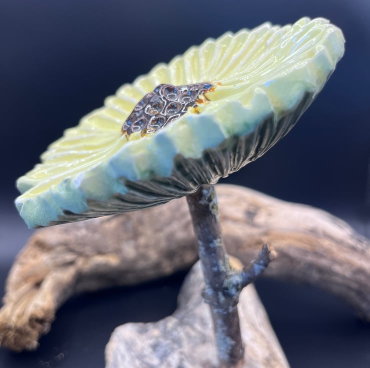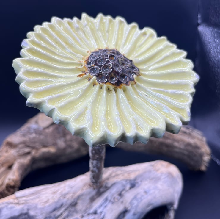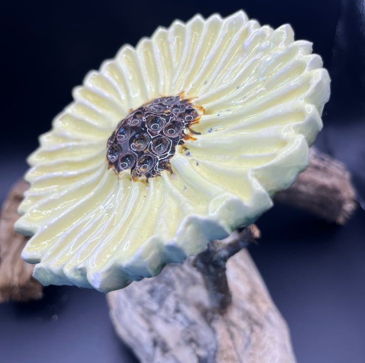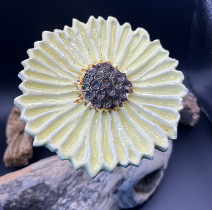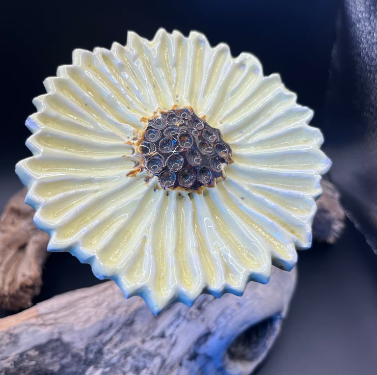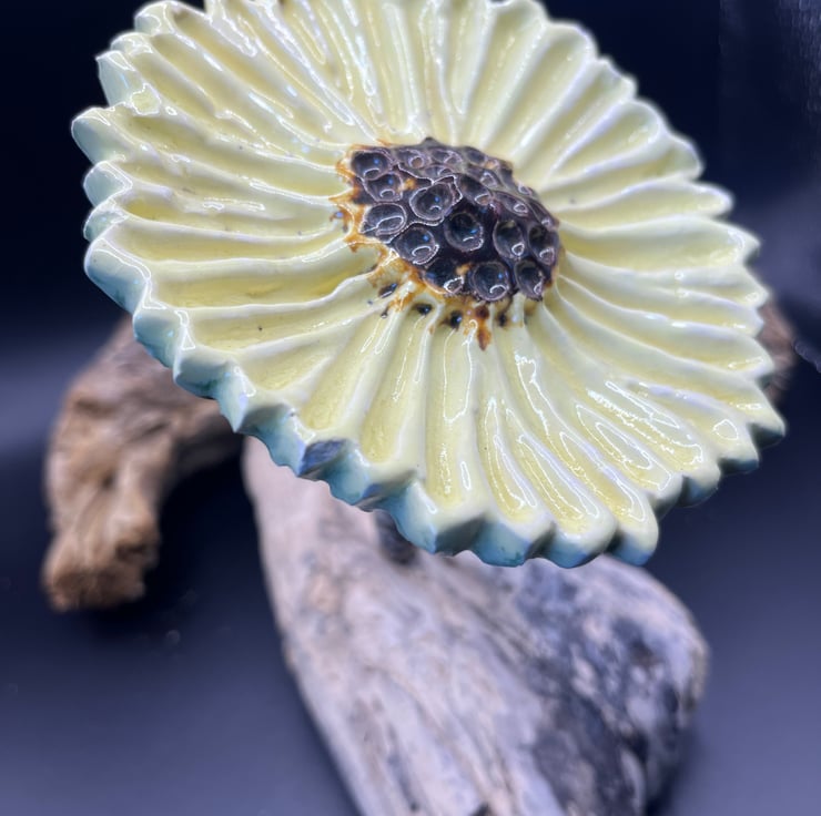 Sunflower ceramic cane topper made with white clay…glazed with yellow /brown & green glaze …fired to 1060c …115mm diameter &45mm deep with a 9mm hole in the base for a cane/branch (not supplied)…looks good amongst real flowers…not frost proof…thanks for looking…