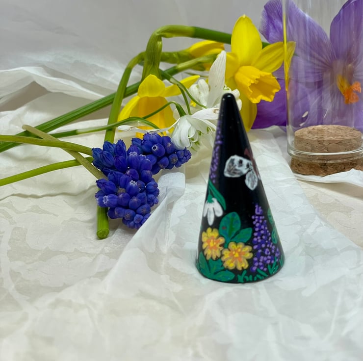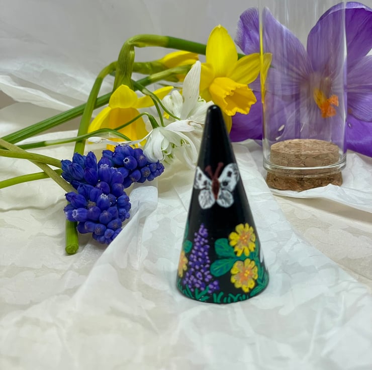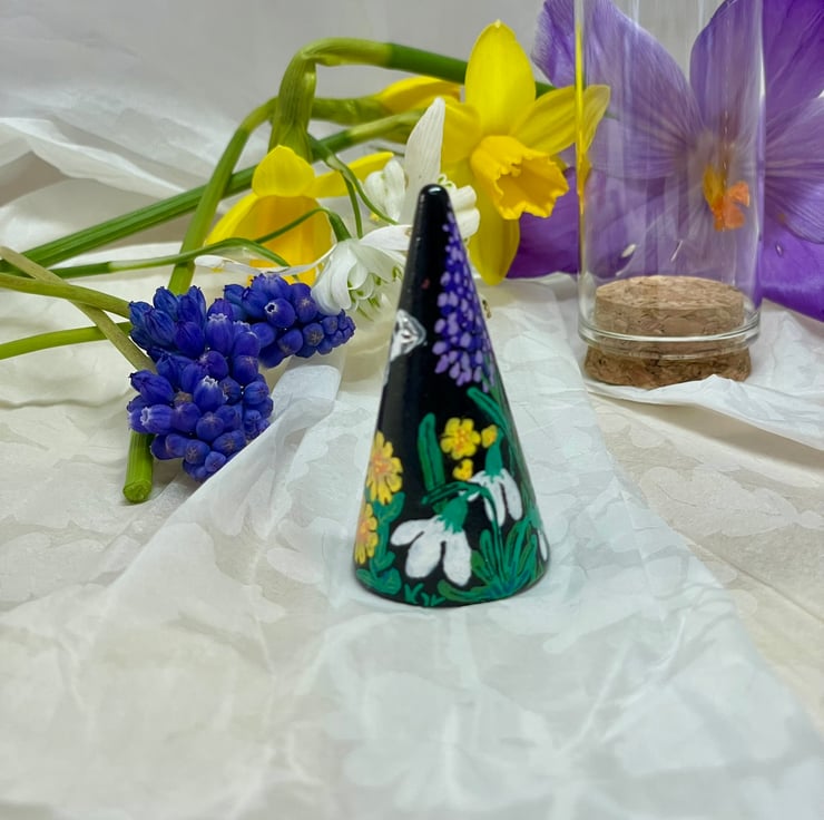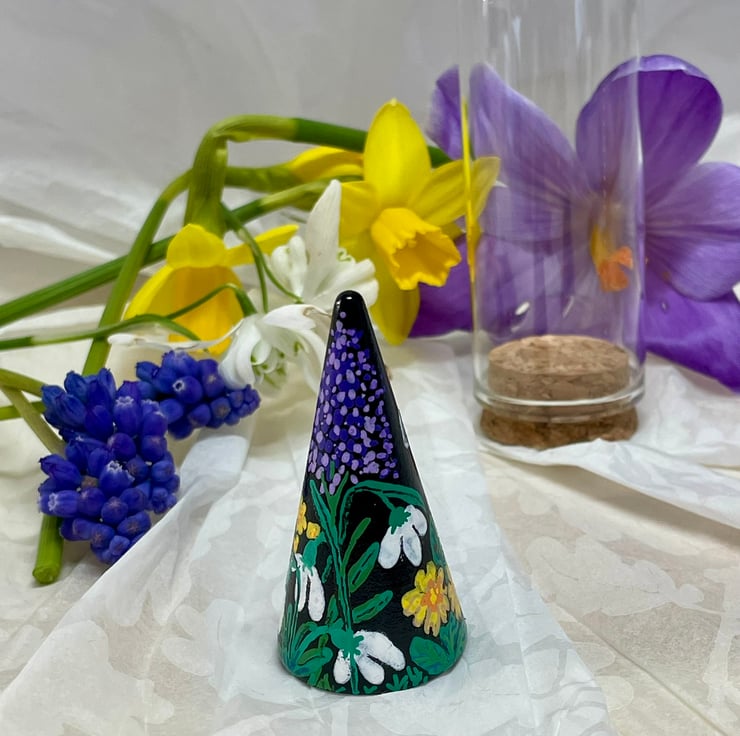 Another one of my hand painted wooden cones. This time I have painted some of my favourite spring flowers..... snowdrops, primroses and blue grape, with a delicate butterfly amongst them. This like the others comes with a glass dome to display the piece in if you prefer. These small cones make lovely One-of-a-kind gifts to celebrate many occasions.