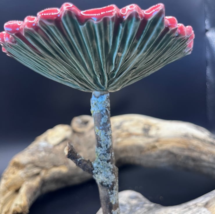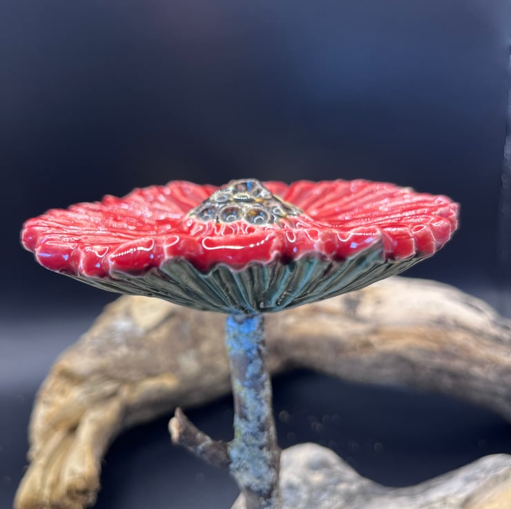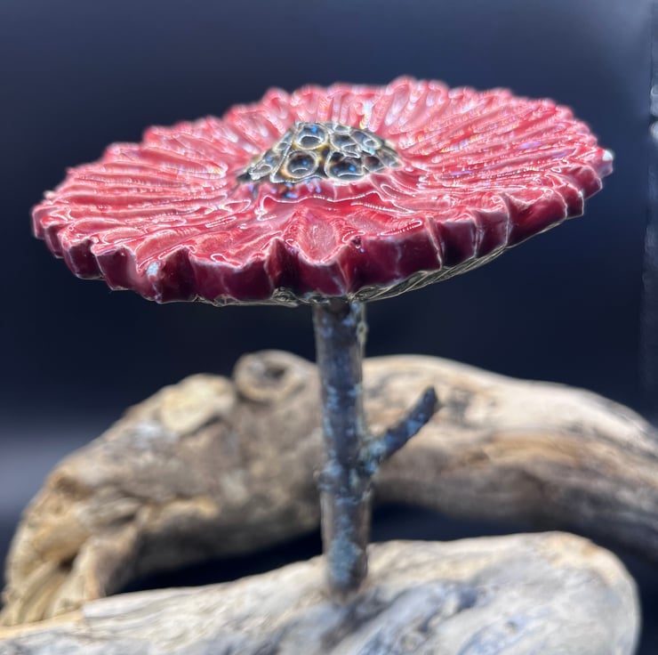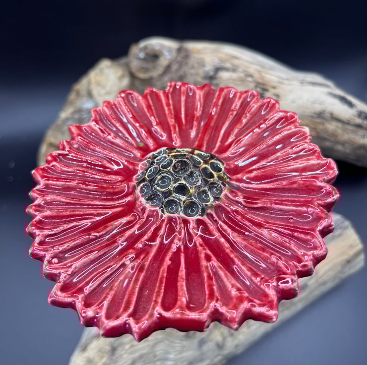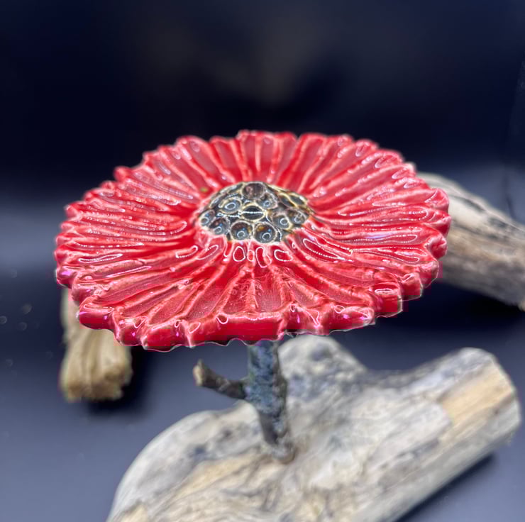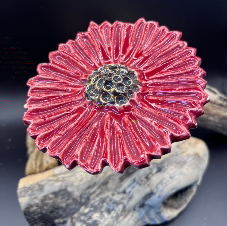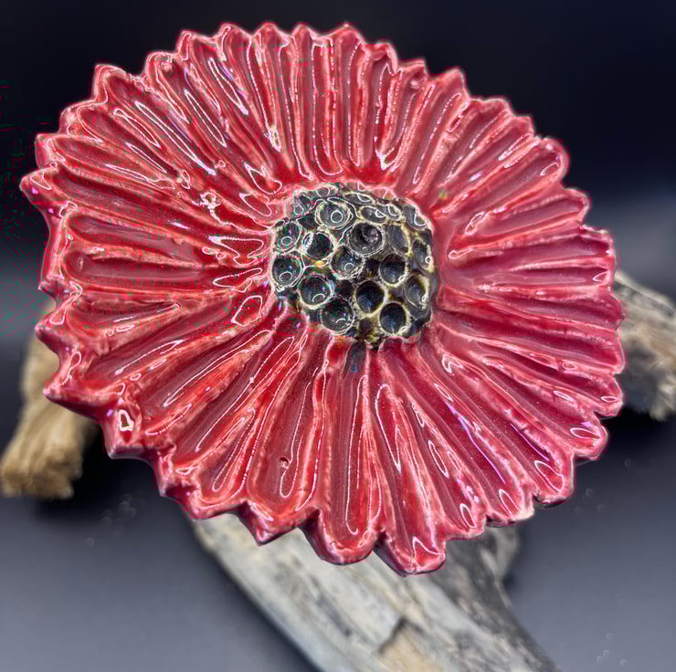 Red sunflower cane topper made with white clay and glazed with red/green/brown & clear glaze…fired to 1060c …115mm diameter &45mm deep…and with a 9mm hole in the base for a cane/branch (not supplied)…look good amongst real flowers…thanks for looking…