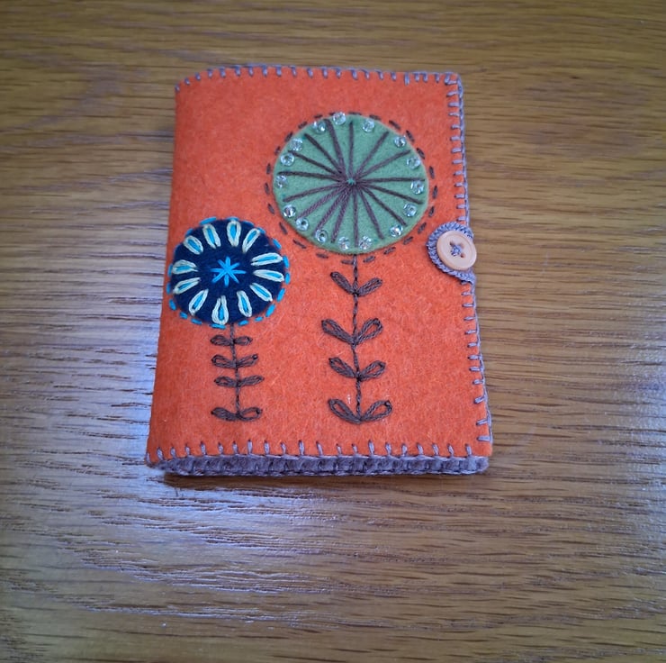 Pretty needle case. Handmade and hand embroidered by me, with felt flowers and beads. Made from high quality wool felt. Measures 3 Inches x 4 Inches. Small pocket for storing small scissors or needle threader. Button fastener. Not made on a sewing machine except to attach the pages inside. Great for taking on holiday. Thoughtful little gift. Free p&p