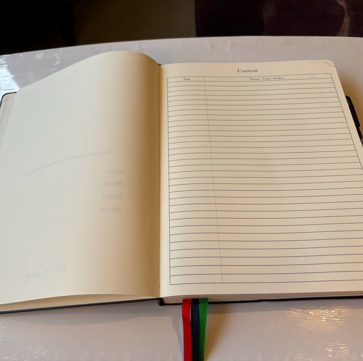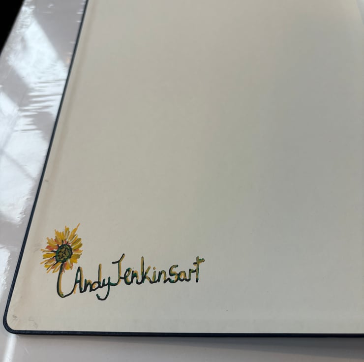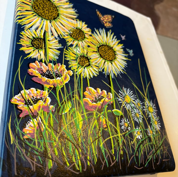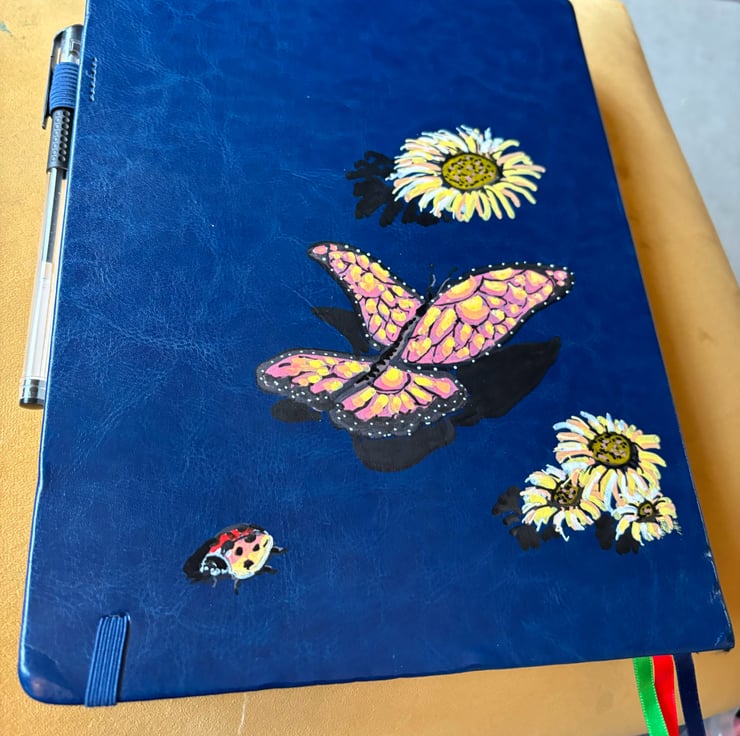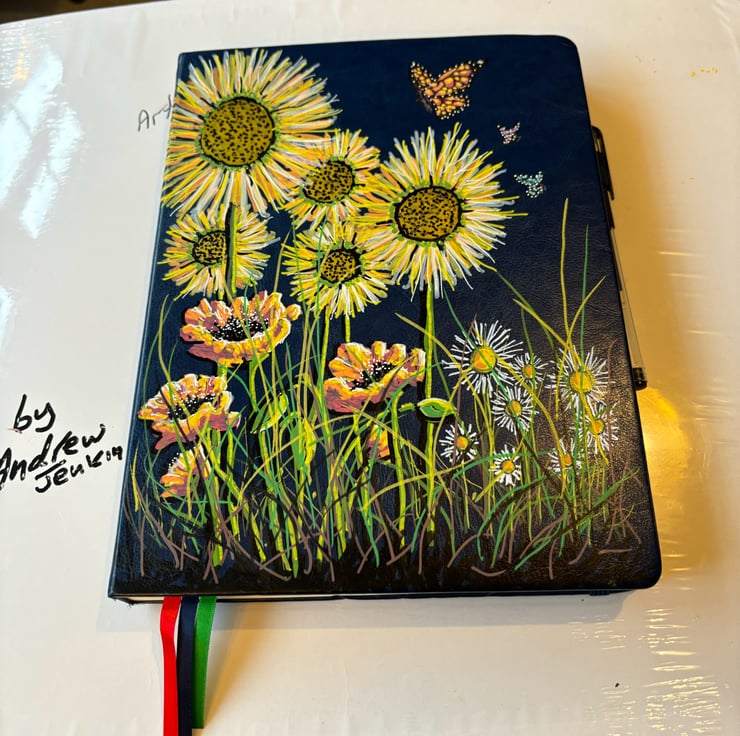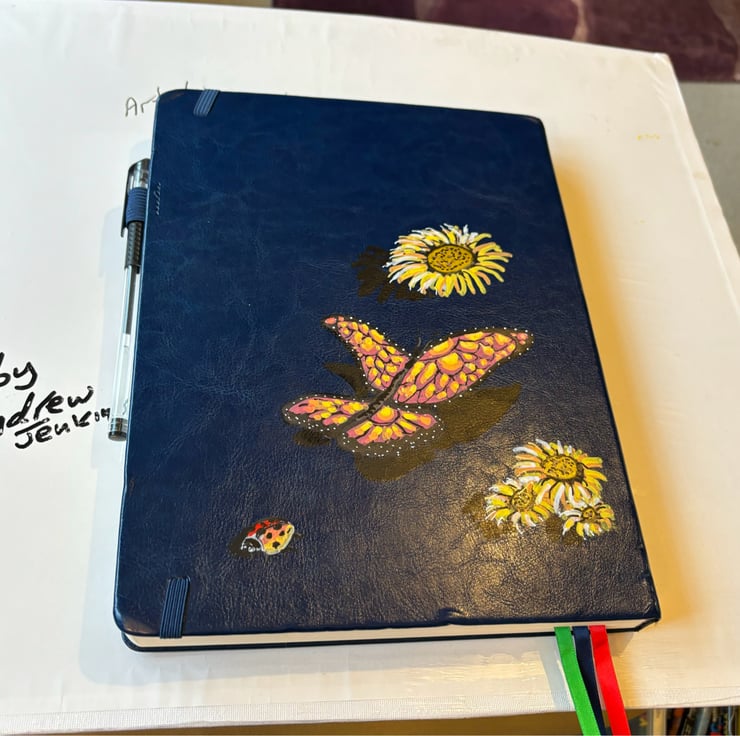 A hand painted and sealed hardcover journal by Andrew Jenkins with pen