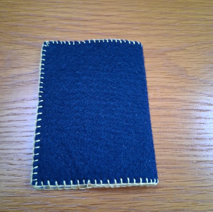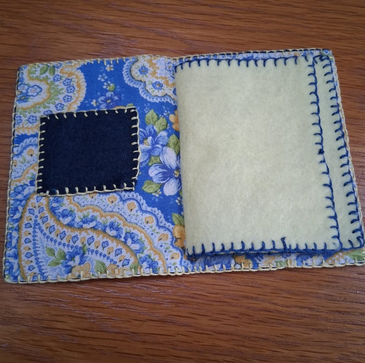 Handmade navy blue felt needle case. Strawberries and leaves made of felt and embroidered onto the front. Lined with 100% cotton in a pretty blue and yellow floral pattern. Space for small embroidery scissors or needle threader. 3 inches x 4 inches. Great to take away on holiday. Free p&p