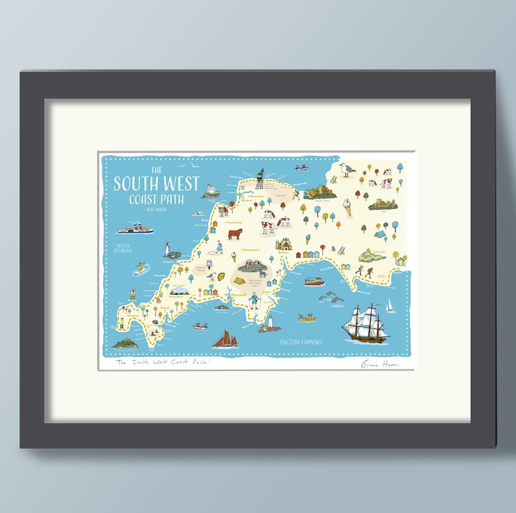 Beautiful illustrated wall map showing the route of the South West Coast Path - Britain's longest footpath, which takes walkers along the incredible coastlines of Cornwall, Devon, Dorset and part of Somerset.