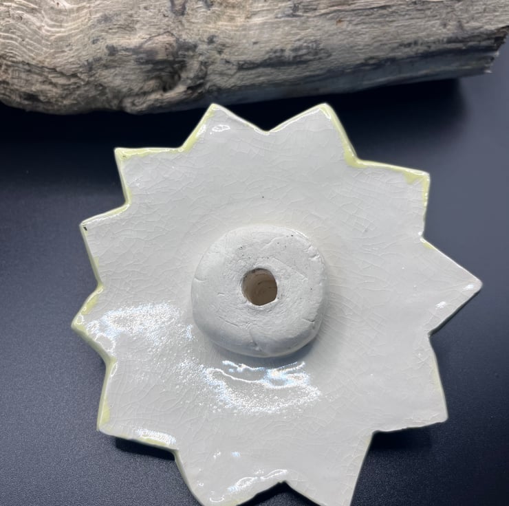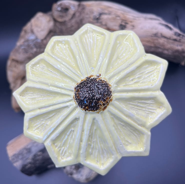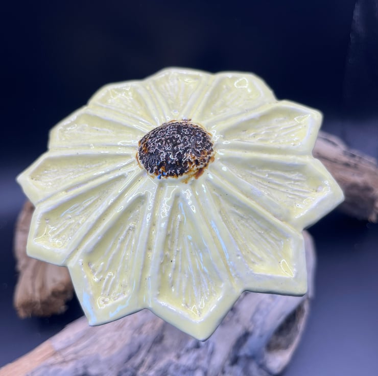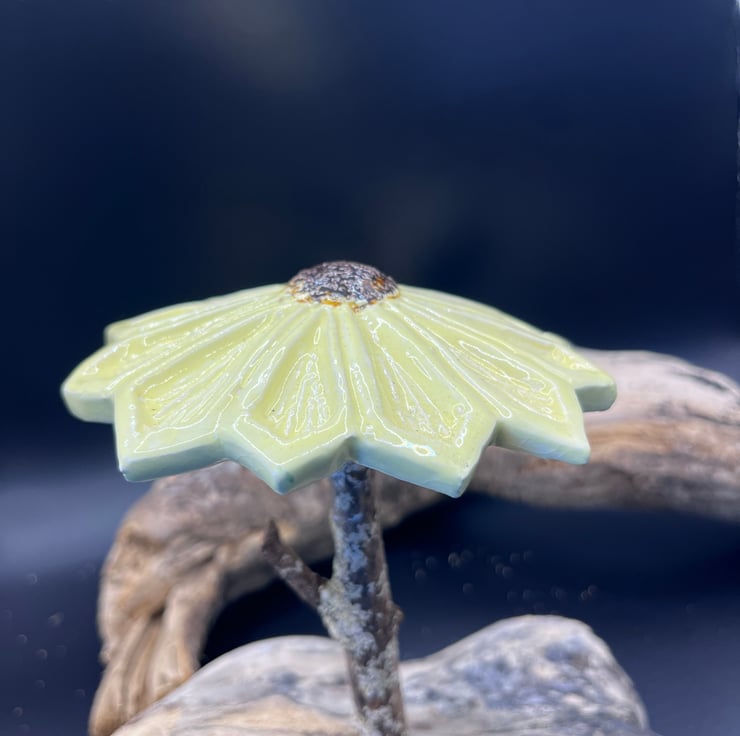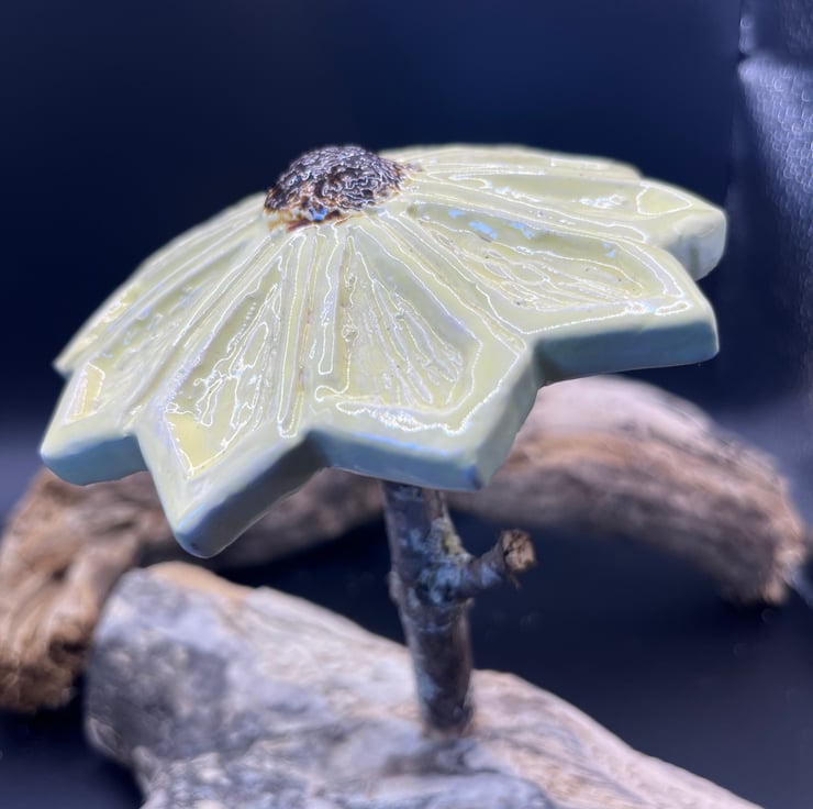 Ceramic flower cane topper made with white clay and glazed in yellow and brown centre fired to 1060c …9mm hole for a cane/branch (not supplied) …looks good amongst real flowers…not frost proof….