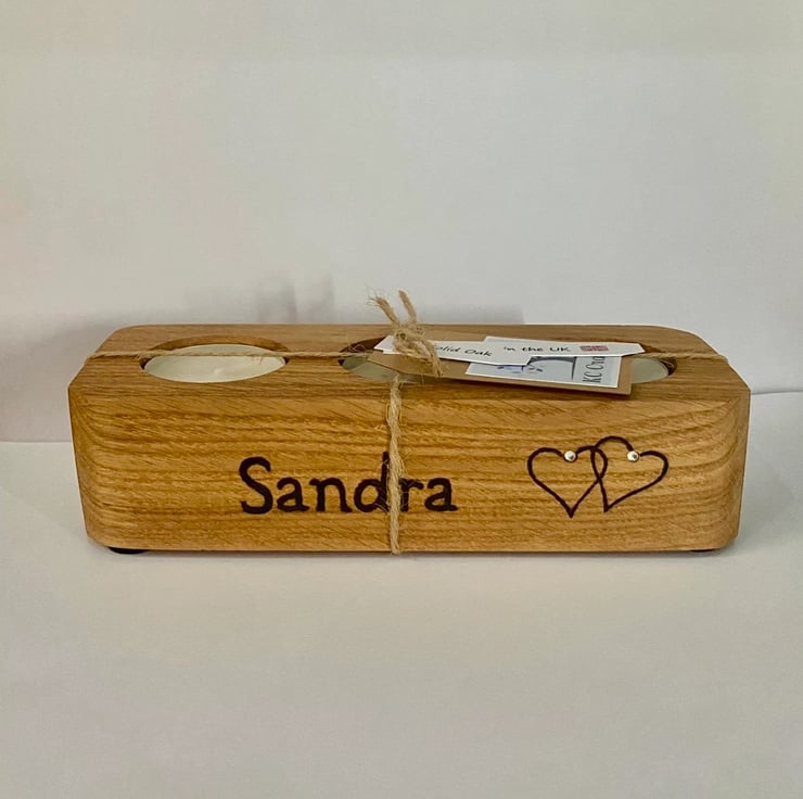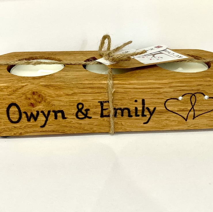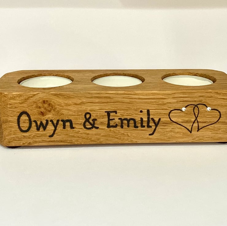 Beautiful Solid Oak Wooden Triple Tea Light Holder with Personalised Pyrography Name or names and double hearts design with inset gemstones, finished with Danish Oil and Anti Scratch Feet.
