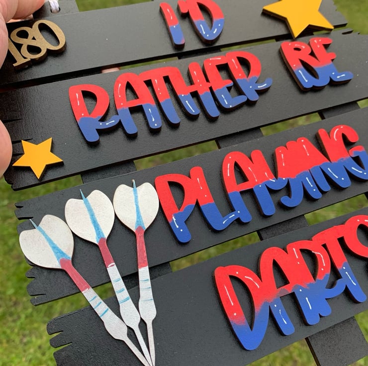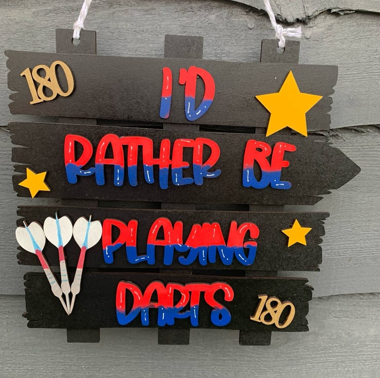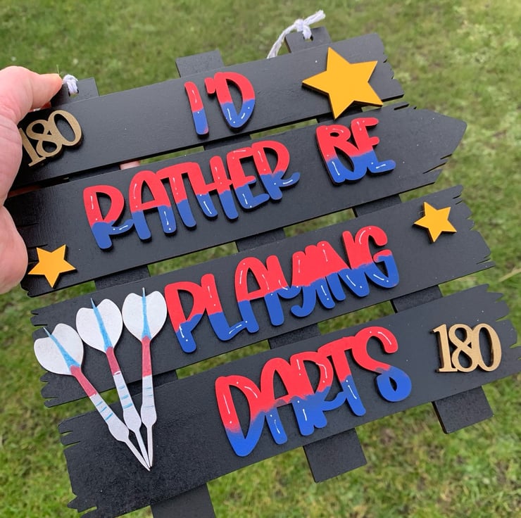 A unique hand-painted plaque for any darts lover. The driftwood-like background planks are black and the 3d dart themed embellishments are a combination of red, blue , white, yellow and gold. There's everything you'd expect for a darts theme with 180, stars and the essential darts!