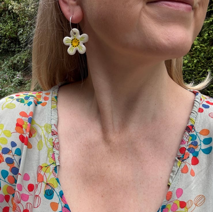 Each pair features a delightful combination of white and yellow flowers that bring a touch of nature's beauty to your everyday style. The intricate craftsmanship of the porcelain flowers ensures that no two pieces are exactly alike, making them a unique addition to your accessory lineup.