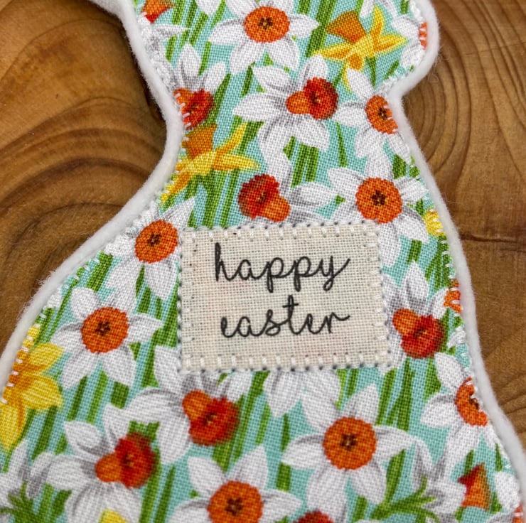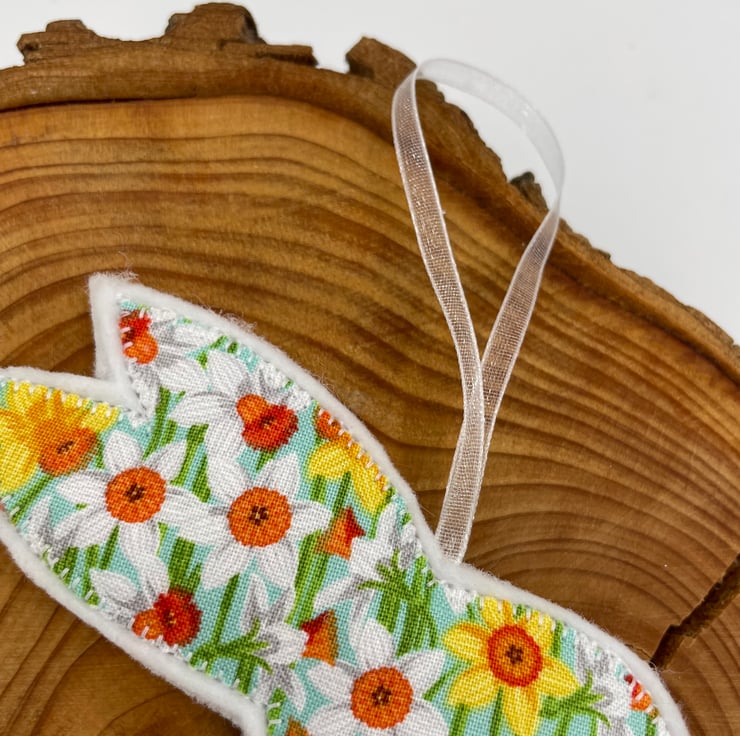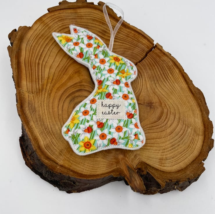 Bring a touch of springtime charm to your home with this sweet Easter bunny hanging decoration. Made from pretty daffodil-print fabric, it's softly padded for a cozy feel and backed with crisp white felt. A delicate organza ribbon loop makes it easy to hang, adding a cheerful, handmade touch to your Easter celebrations. Finished with a ‘Happy Easter’ message, it’s the perfect way to spread a little seasonal joy!