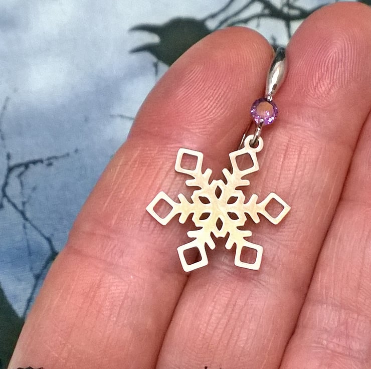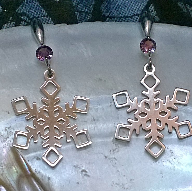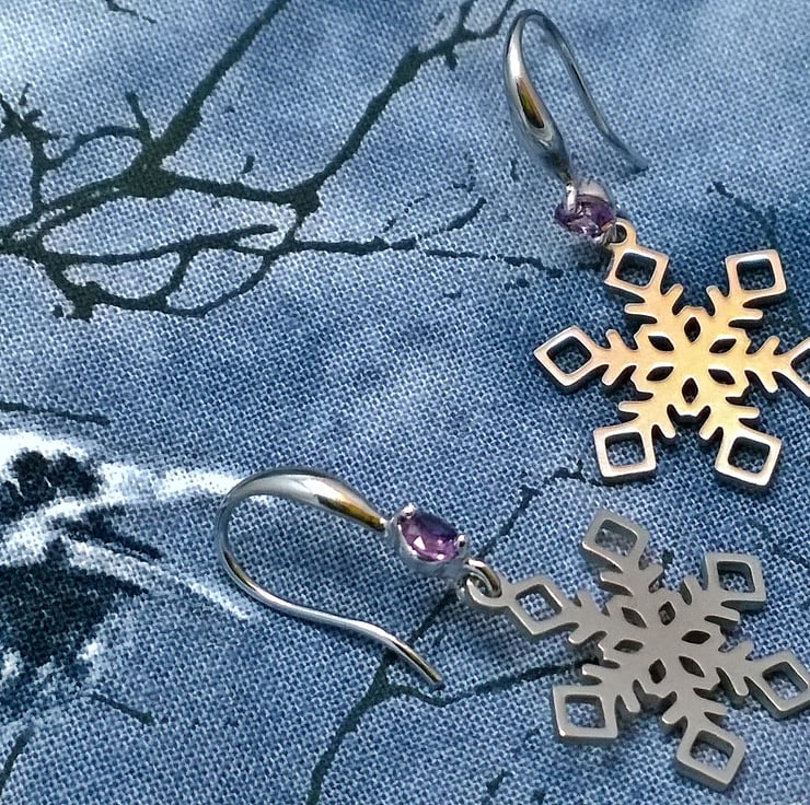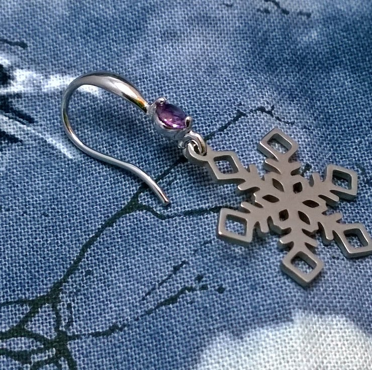 A pair of stainless steel snowflakes dangle from 19 k white gold plated fancy ear hooks set with a glittering amethyst coloured zirconia crystal.
