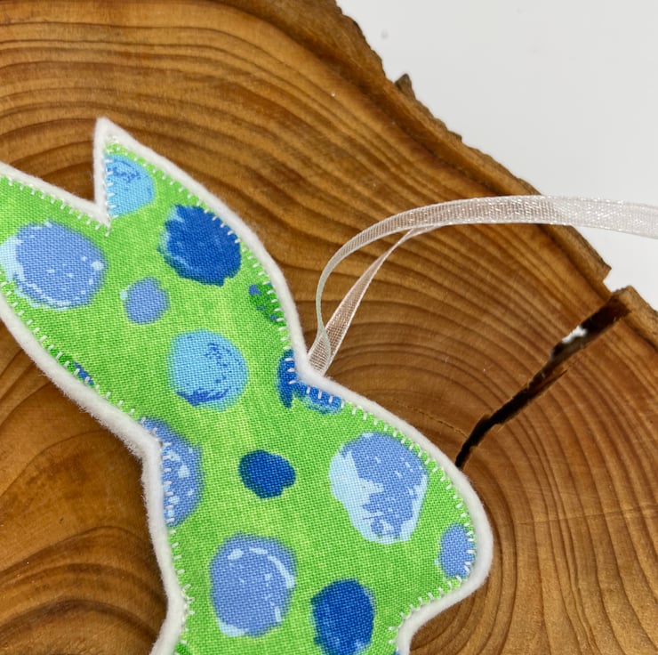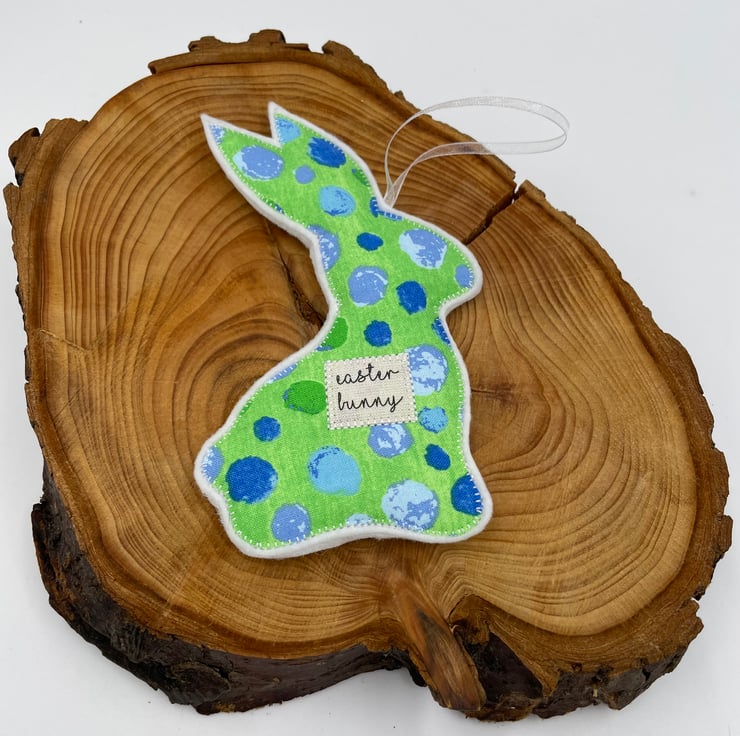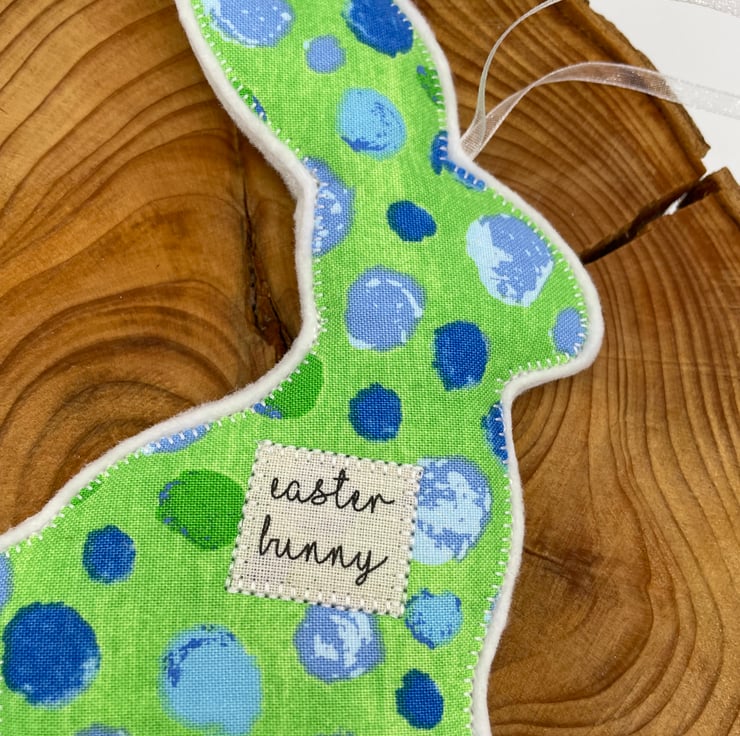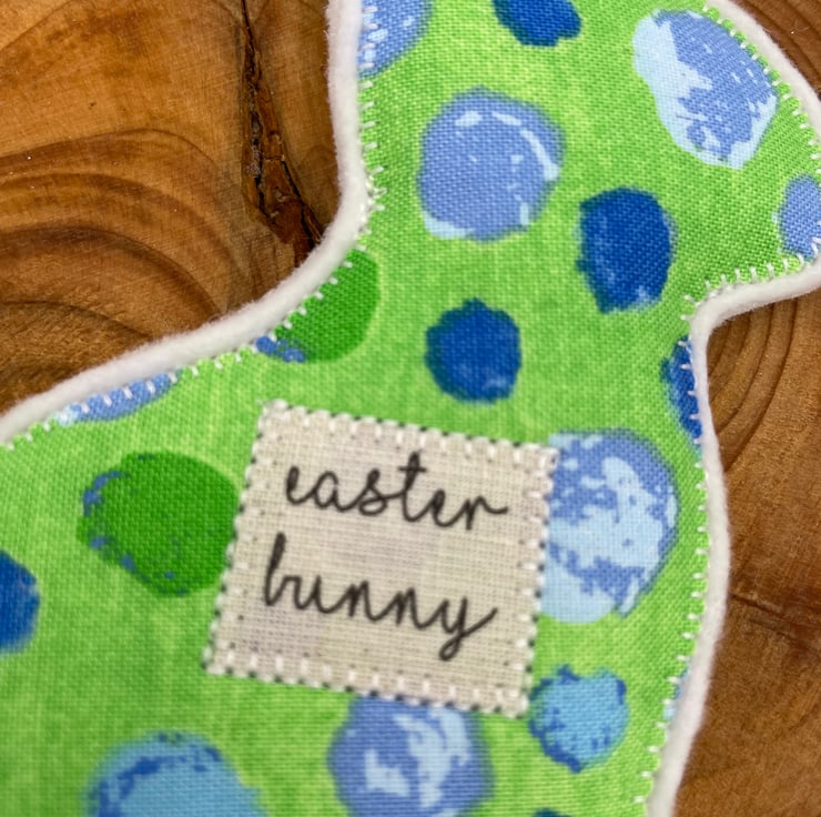 Add a pop of color to your Easter celebrations with this cheerful hanging bunny! Made from bright green and blue abstract cotton fabric, it’s soft and squishy with a bit of polyester wadding and backed with felt for a cozy, handmade feel. A delicate organza ribbon loop makes it easy to hang anywhere, while the “Easter Bunny” label adds a playful touch. A simple, fun, and festive decoration for spring!