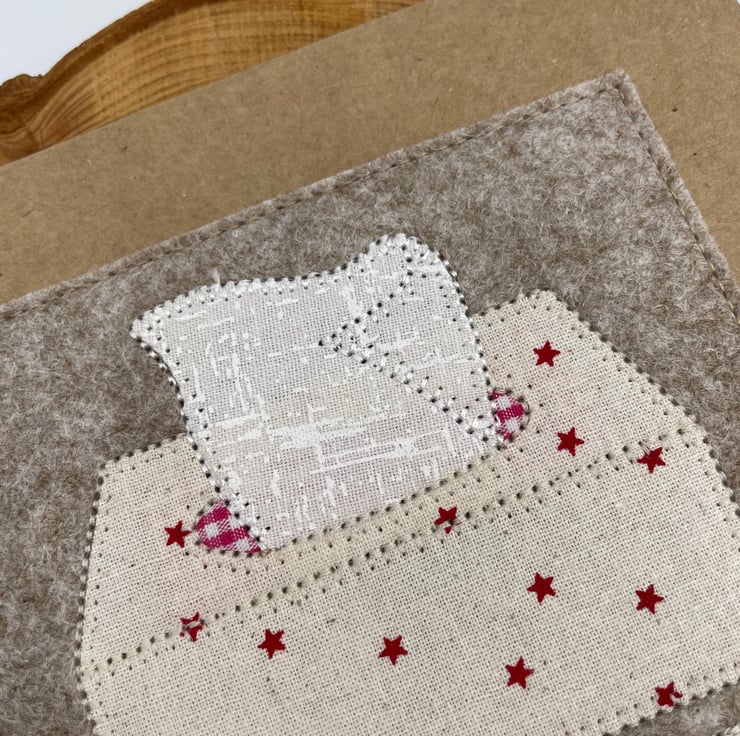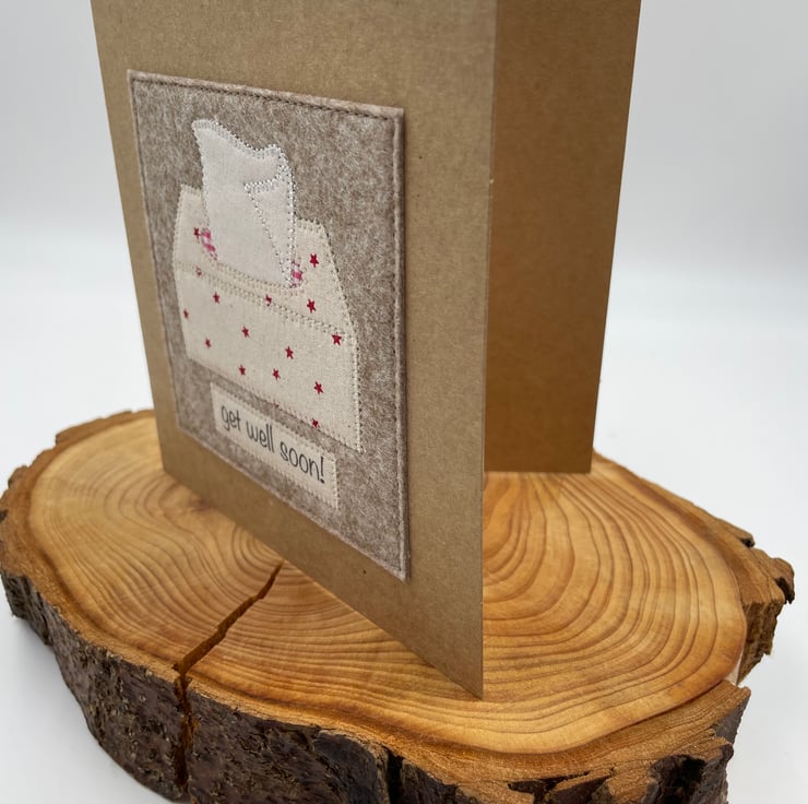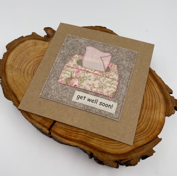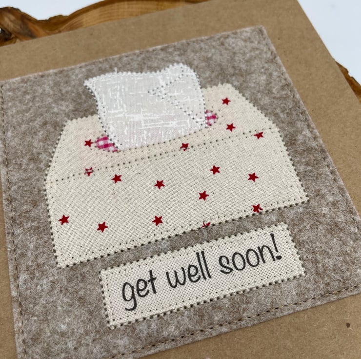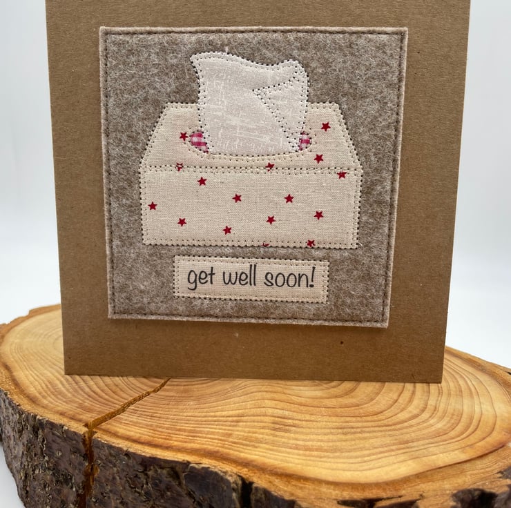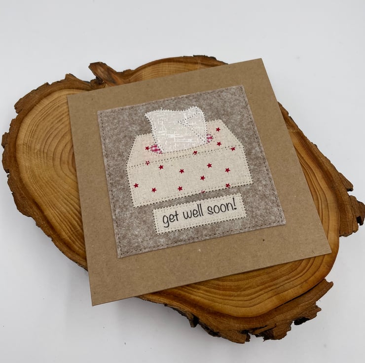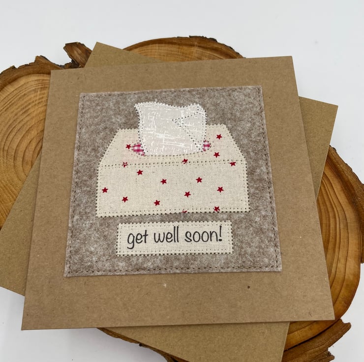 A little cheer to brighten someone’s day! This handmade appliqué card features a charming tissue box crafted from pretty star fabric, complete with a delicate ‘Get Well Soon’ message. Thoughtfully stitched with love, it’s a warm and heartfelt way to send comfort and well wishes to someone in need of a little pick-me-up.