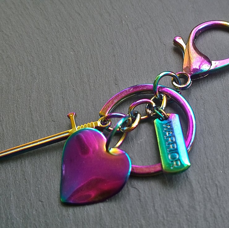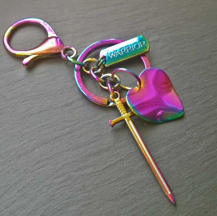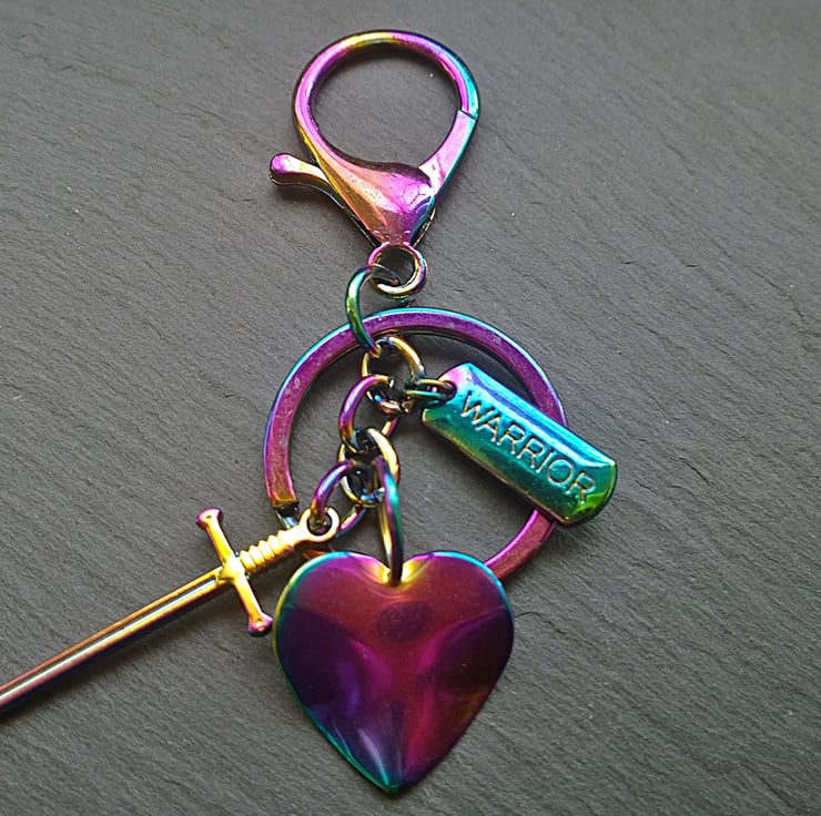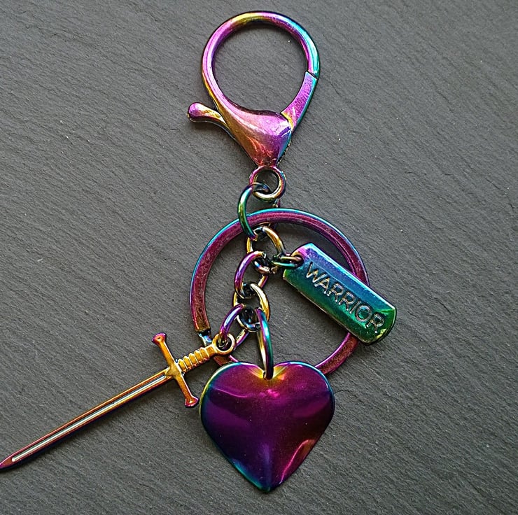A handmade, unique, rainbow plated metal keyring with multiple charms as pictured. The one you see here is the one you will receive but please do look through my other keyrings as I have a few variations of these available. The number in brackets at the end of the title is my reference number to make sure you get the exact same item you order.