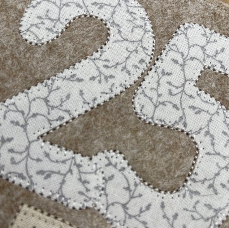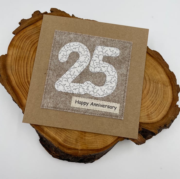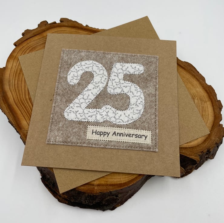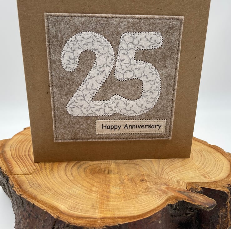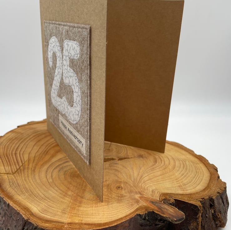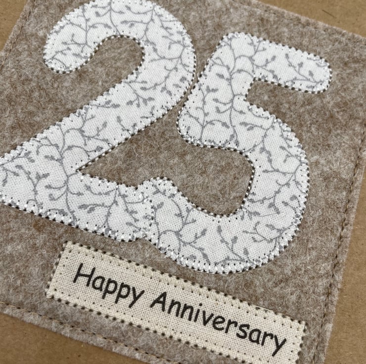 Celebrate a special Silver Wedding with this beautifully handmade appliqué card. The numbers 2 and 5 are cut from delicate white fabric with a silver-grey foliage design and carefully stitched onto soft woollen felt for a cozy, handmade touch. Finished with a “Happy Anniversary” message on recycled card, it’s a simple, thoughtful way to mark 25 wonderful years together.