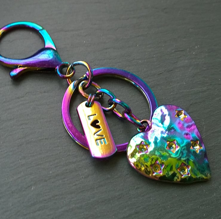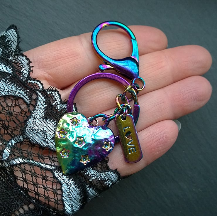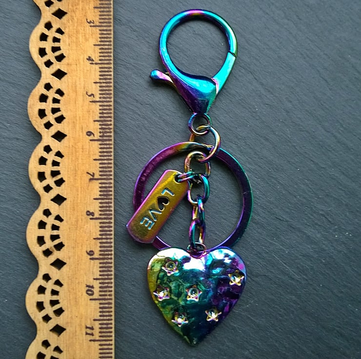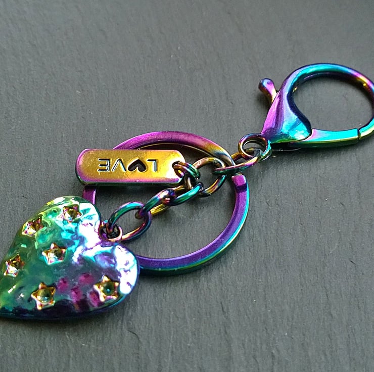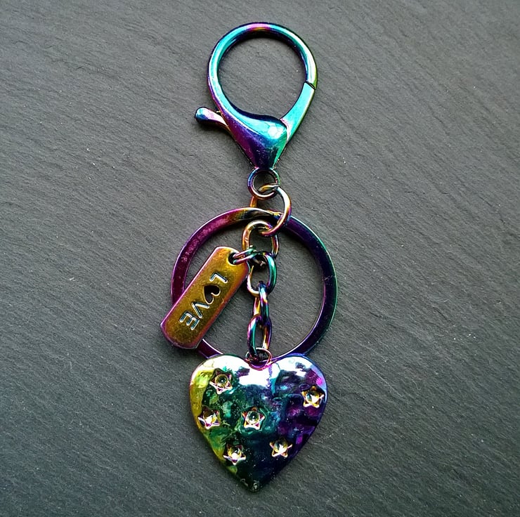 A handmade, unique, rainbow plated metal keyring with multiple charms as pictured. The one you see here is the one you will receive but please do look through my other keyrings as I have a few variations of these available. The number in brackets at the end of the title is my reference number to make sure you get the exact same item you order.