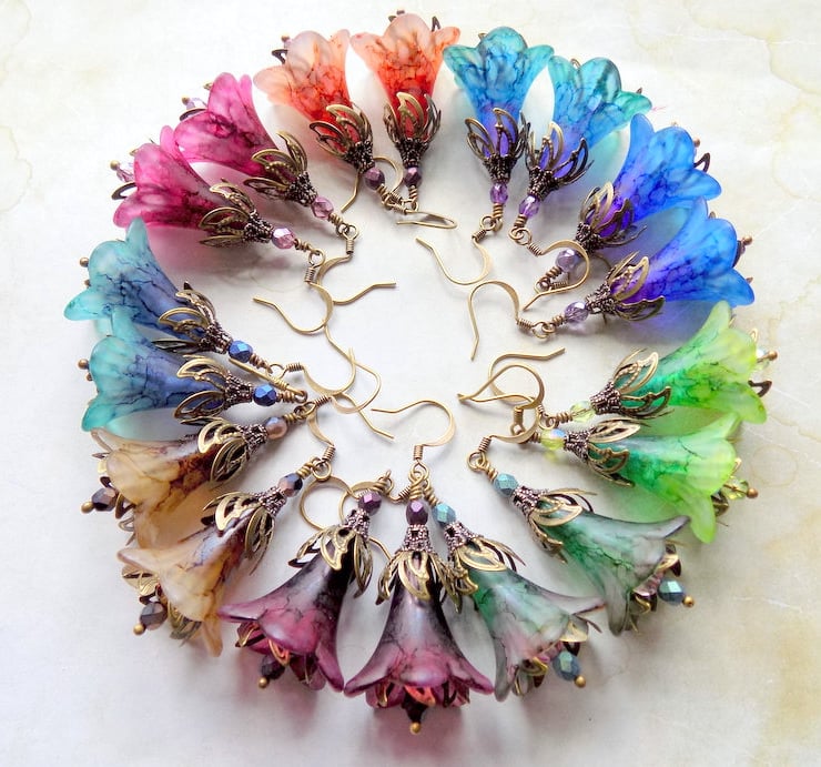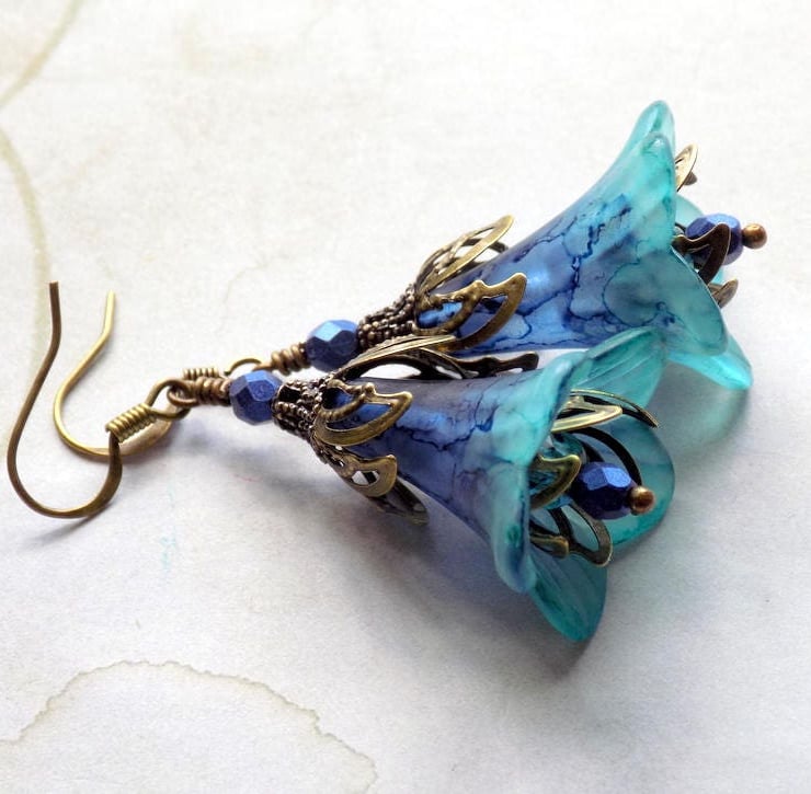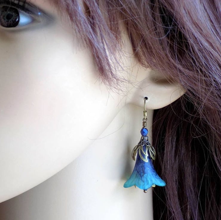 Hand Painted Lucite Large Bell Flower Earrings, exclusive to English Vintage Design, in a gorgeous blend of denim blue and light turquoise, and featuring Swarovski Crystal rounds and Czech glass rounds, with layered antiqued bronze bead caps. They are pictured with hooks but you may choose your desired ear wire from the drop-down menu.