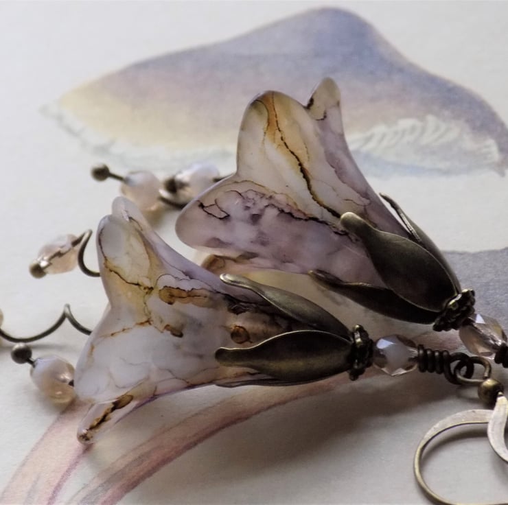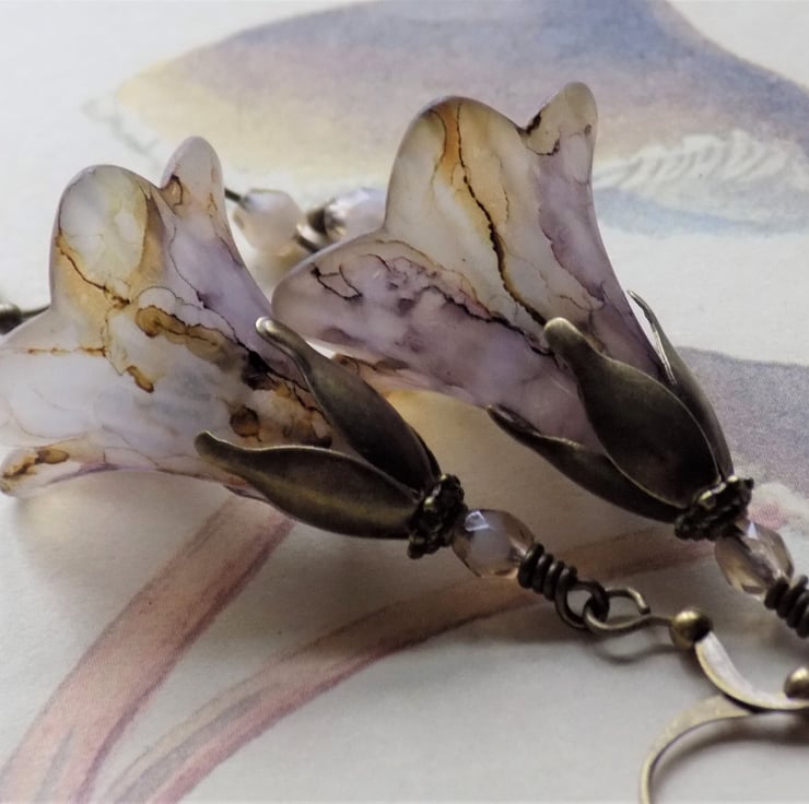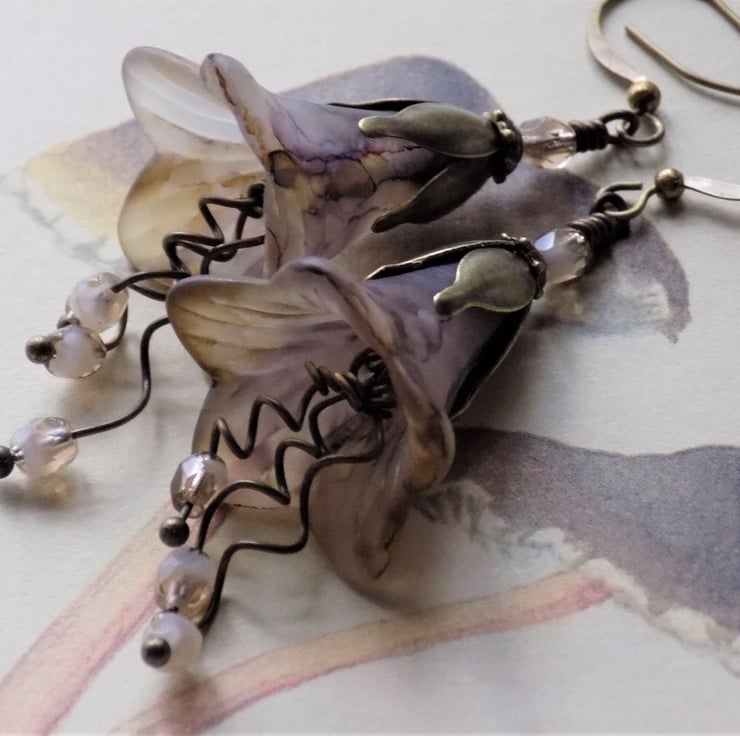'Toadstool' are one of 7 new autumn themed earrings exclusive to English Vintage Design; these lovely earrings feature my larger lucite bell flowers in a blend of mushroom and aubergine, representing one of the many strange toadstools I find while out walking at this time of year. Three hand twisted 'stamens' dangle below, with Czech glass rounds in mushroom and beige, which also sit above the antique bronze bead caps.