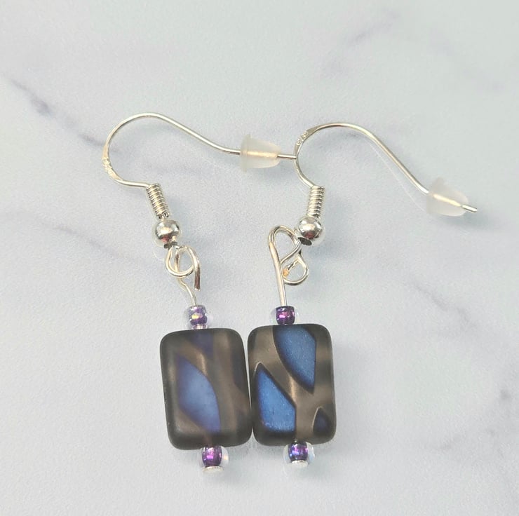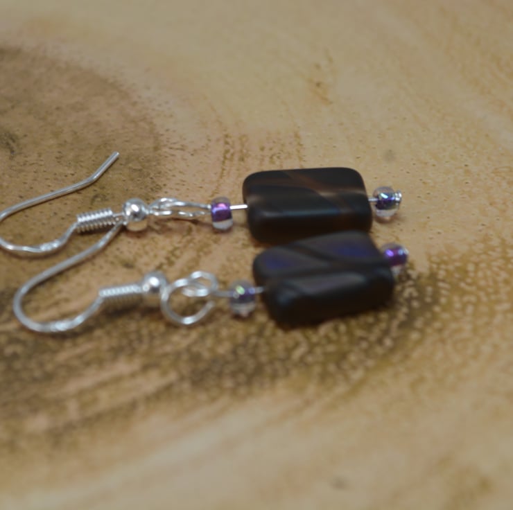 The earrings have been made using Burro peacock rectangular 12x8mm pressed czech glass. The rectangles are matt grey brown in colour and the peacock pattern is dark blue. The hooks are sterling silver and can be changed to clip-ons if required. Please select the correct option from the drop down menu.