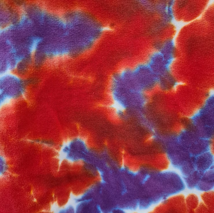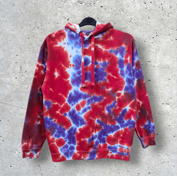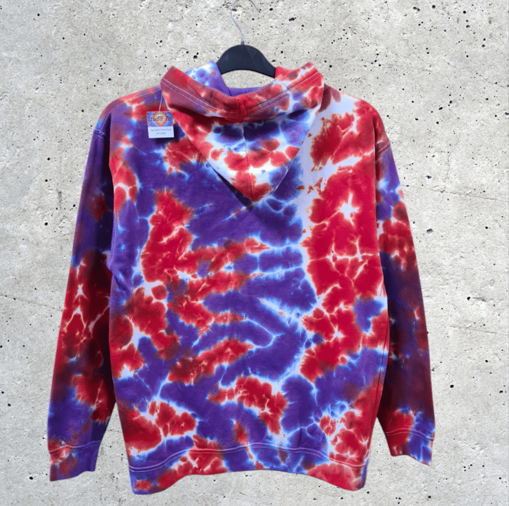 A pullover hoodie hand tie dyed in red and purple. Size medium the chest measures 53cm pit to pit