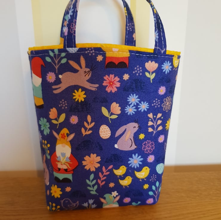 This lovely cotton fabric makes a great little gift bag. Just the right size for a pack of mini eggs. Use for an Easter egg hunt and keep for another year.