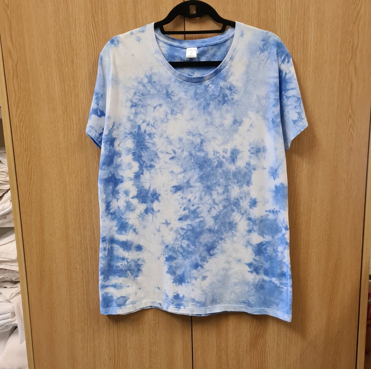 A hand tie dyed t-shirt in blue, ladies size XL. Chest measures 54cm pit to pit
