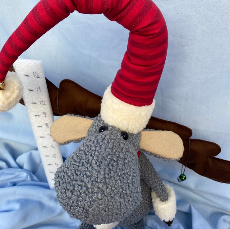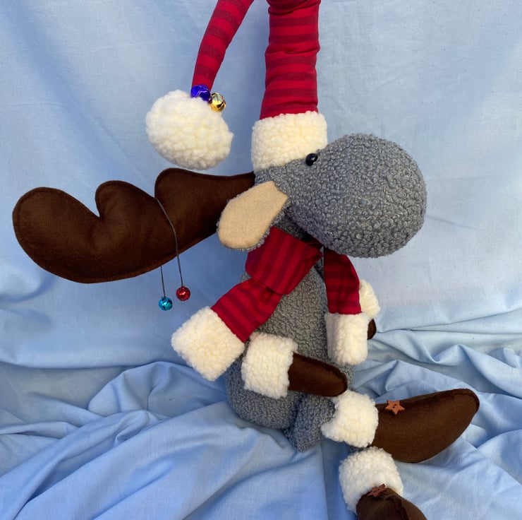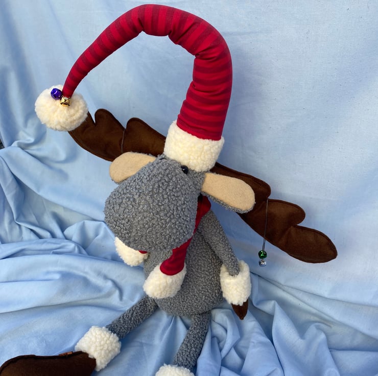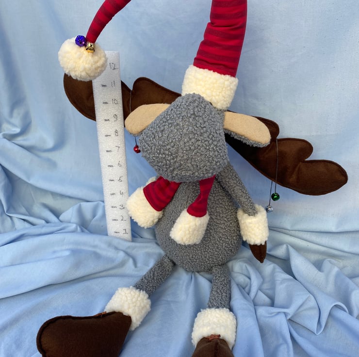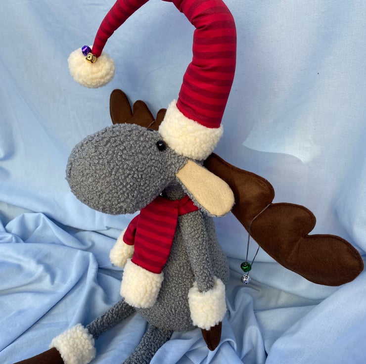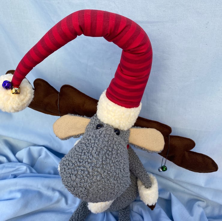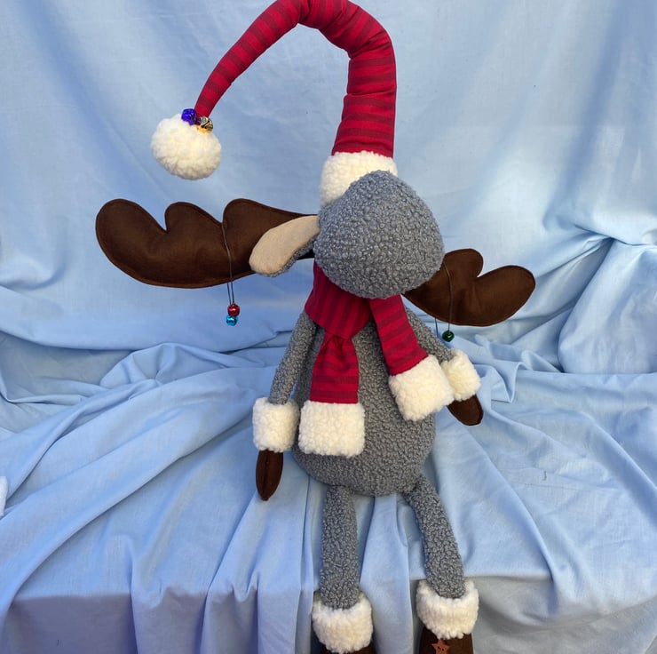 With his long, dangly legs and even longer stripey hat, this Moose is a visitor from Canada who would like to be added to your Christmas display each year. His grey curly coat, brown boots and scarf, which matches his hat, are guaranteed to keep him warm, although he’s used to snow and he’s added colourful bells to his antlers and hat to get into the Christmas spirit.