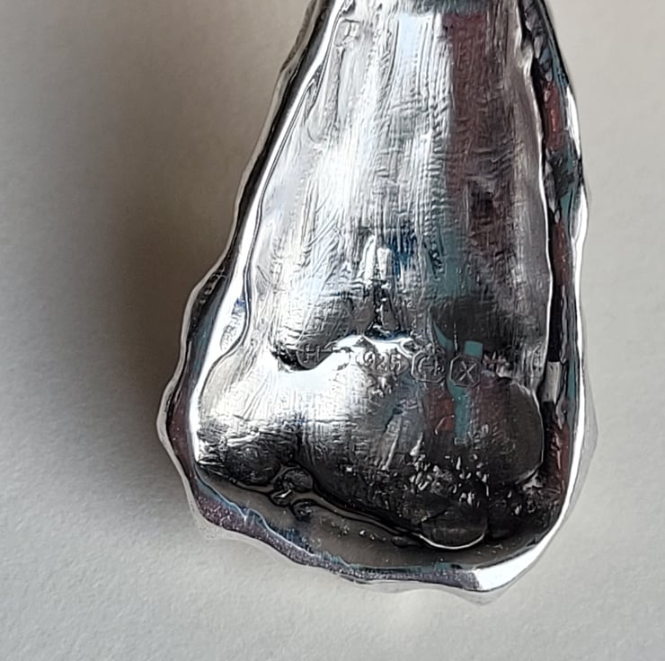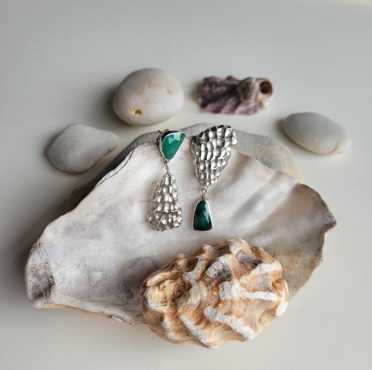 I live and work on Mersea Island, which is renowned for its oysters. Being surrounded by the sea and estuaries its hard not to be inspired by natural landscape and industries that surround you. The emeralds with their faceted freeform shape pairs wonderfully with the shape of the silver oyster inspired forms.