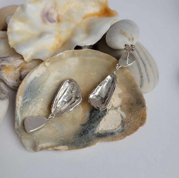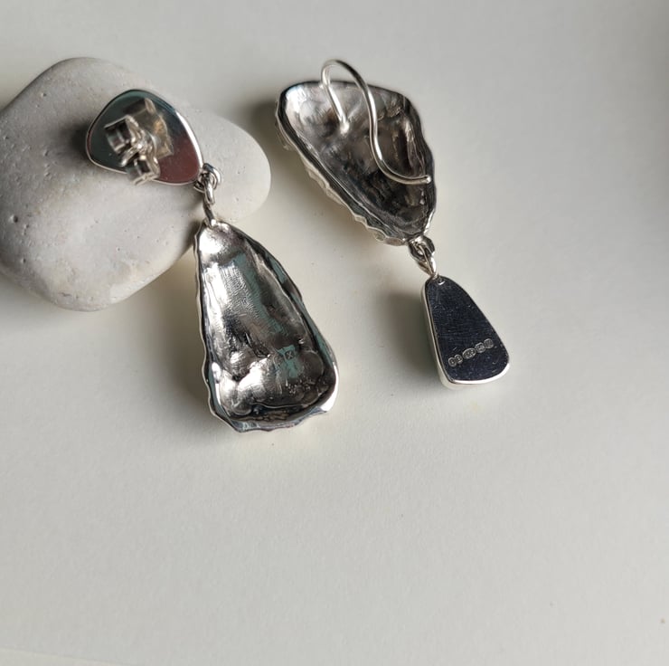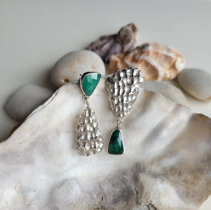 These truly one off oyster shell inspired design have been handmade from sterling silver and Brazilian emeralds. The emeralds have been set into handmade sterling silver bezel settings, one forming the top of the earrings and the other as a drop at the bottom of the earring. The oyster shells have been first hand carved by myself from casting wax. They are then cast in solid sterling silver, I had soldered on hoops and a unique handmade earring hook to join all the elements together.