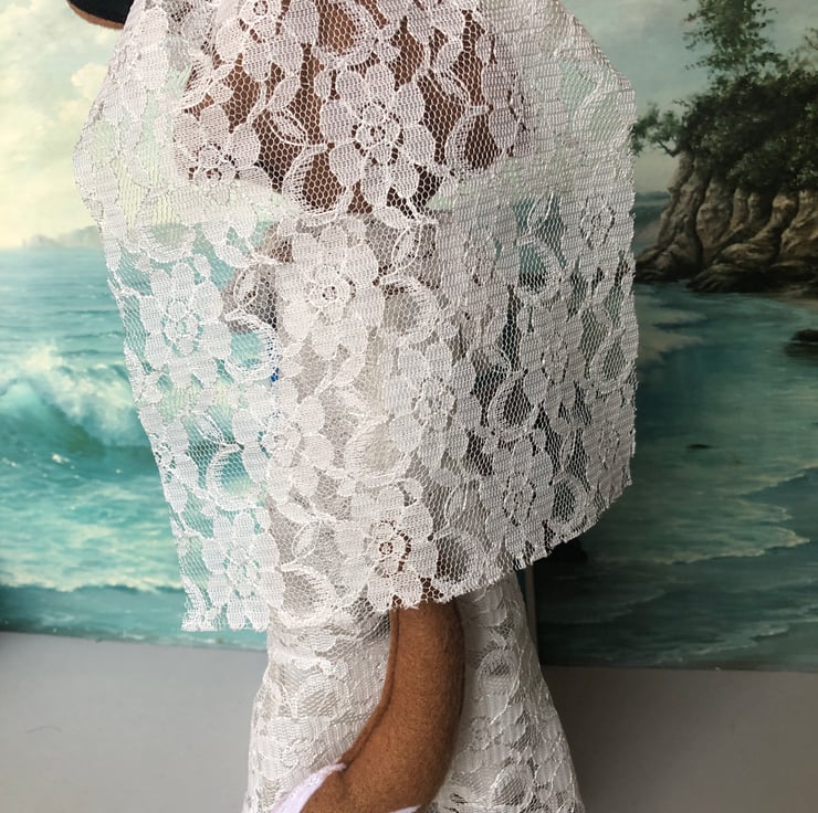 The dress is stitched onto the fox and made from a lacey fabric with an underskirt (for modesty!) and decorated with glued on pearly coloured seed beads.