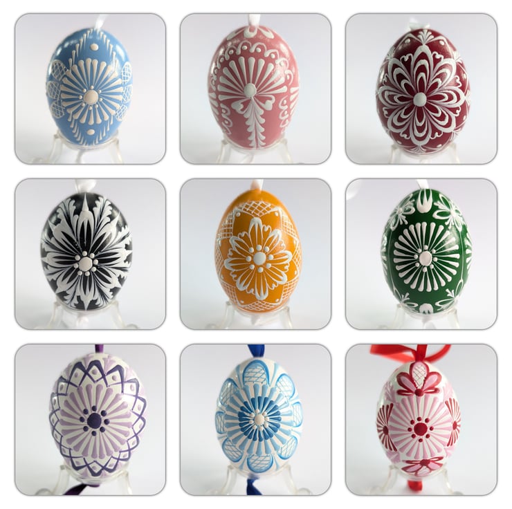 Real Chicken Eggs, Blown, Painted and Wax decorated by hand.