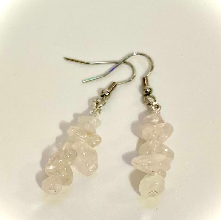 A very pale Pink coloured Rose Quartz chip has been used to make these simply designed earrings. With stainless steel ear wires.