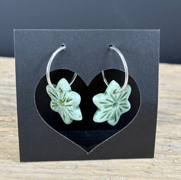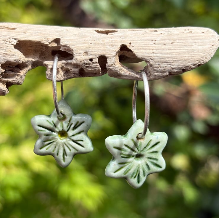 Sterling Silver Endless Hoop Leaf Earrings with Handmade Glazed Porcelain Stars