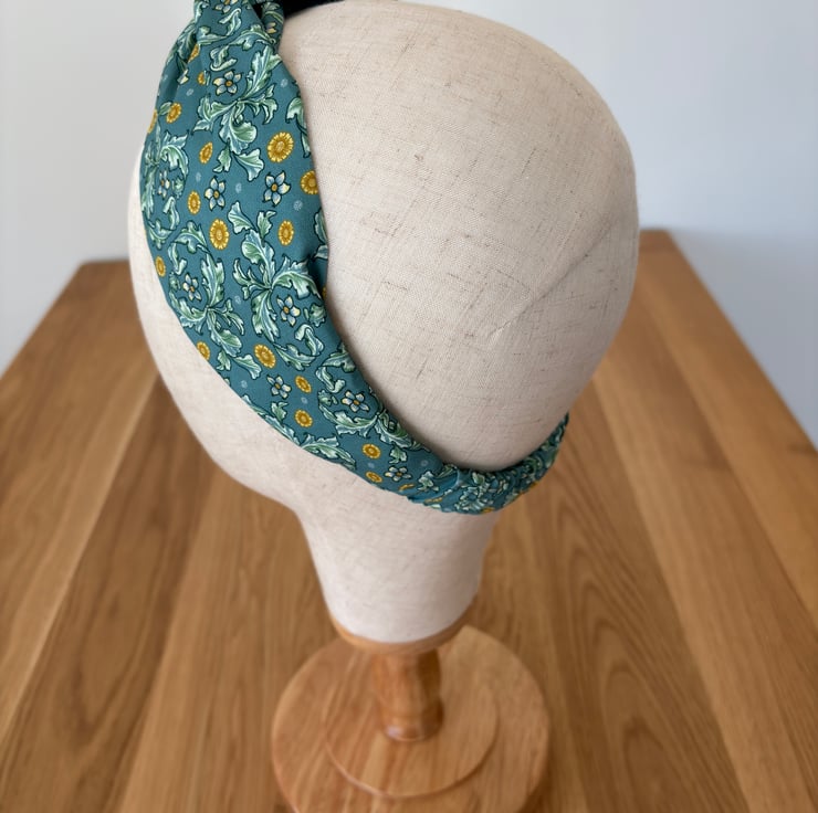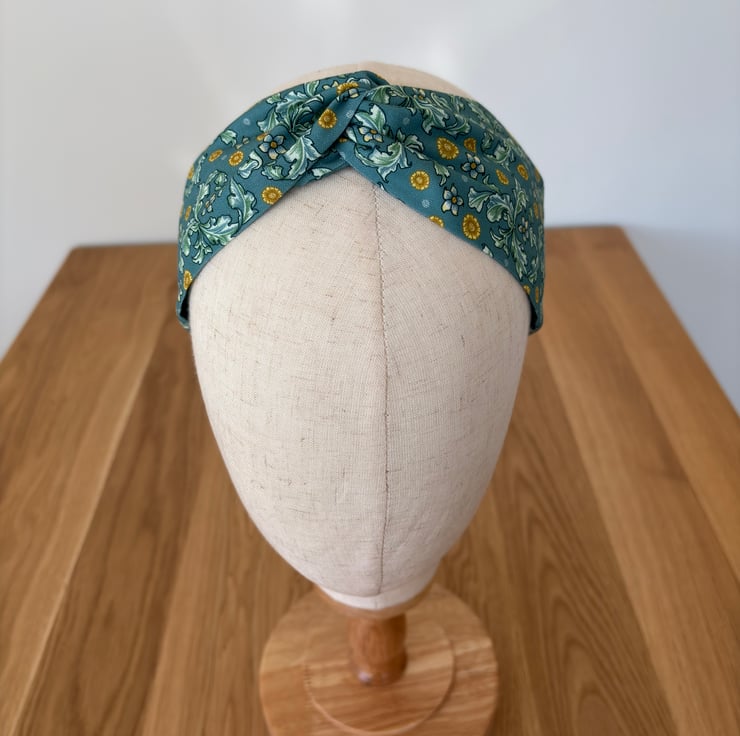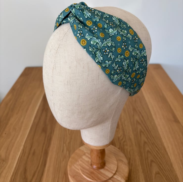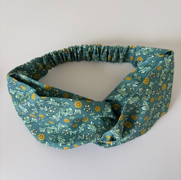 Handmade twist knot headband in soft quilting cotton with a fresh floral pattern in green, yellow and white.