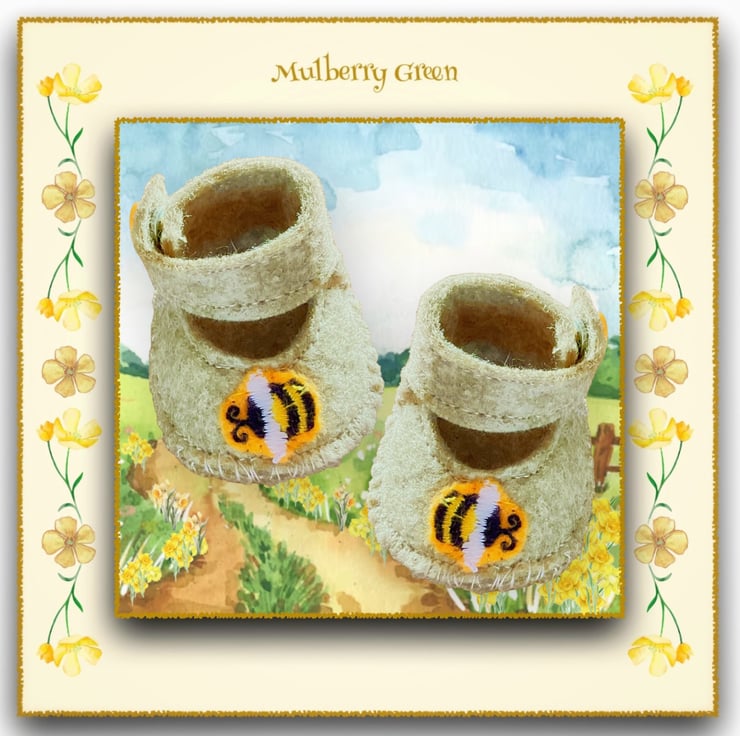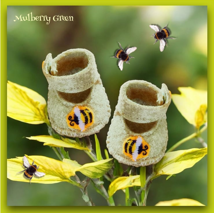 A cute little pair of felt shoes, embroidered with bumble bees, to fit the Mulberry Green dolls.