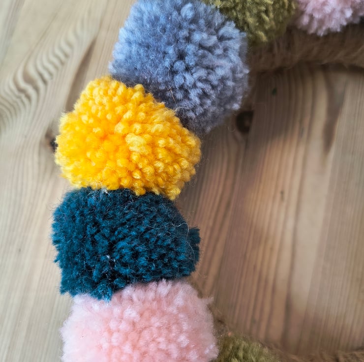 Welcome a touch of cozy whimsy into your space with this handmade pom-pom wreath! Crafted with love and a whole lot of fluff, this wreath features a dreamy mix of colours from each season - sage green, pale pink, golden yellow, and gentle grey. It measures 22cm diameter – perfect for adding a sweet and cheerful touch to any door, wall, or mantel.
